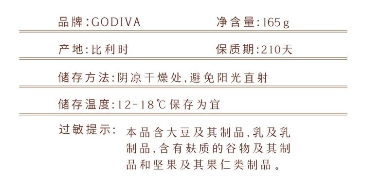 比利时原装进口。新鲜空运直达,隔离存放,温控运送,保证巧克力从出品到入口,味道依然新鲜可口。