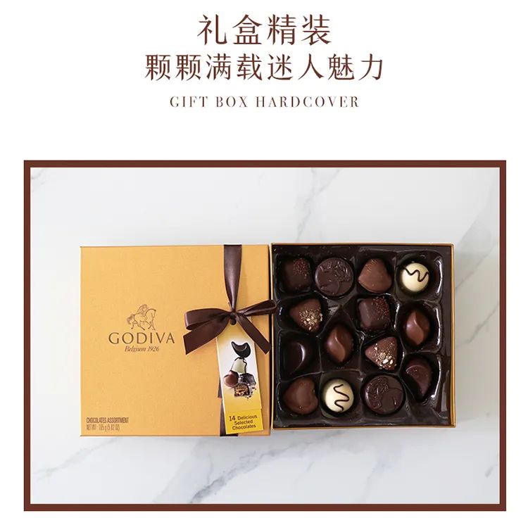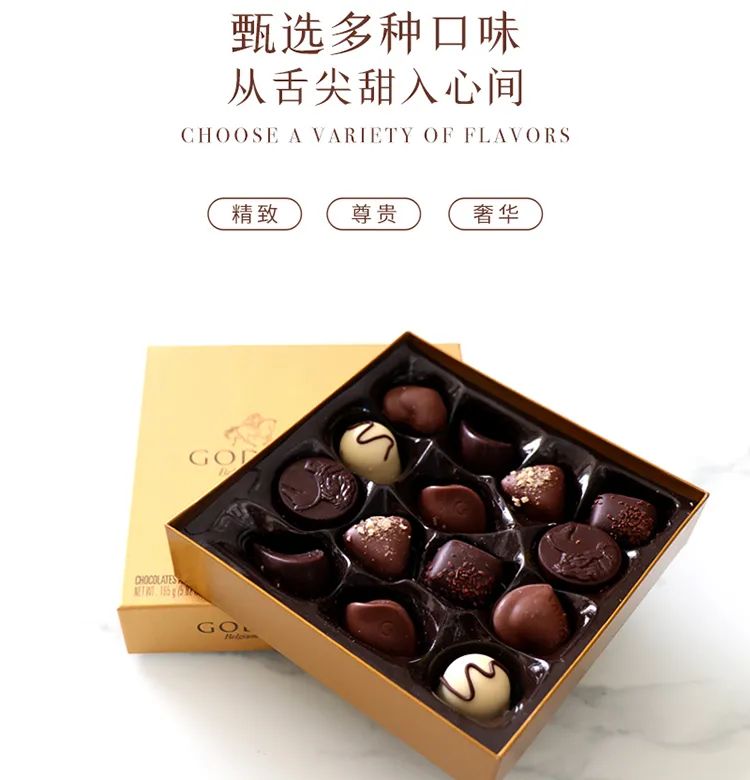 来自全球精致手制巧克力的创制者——歌帝梵巧克力公司 (Godiva Chocolatier )的巧克力:柔软浓滑、甜而不腻、入口即化,是节日送爱人、送家人、送好友的绝佳选择。