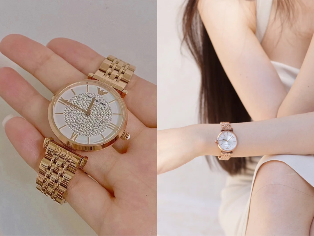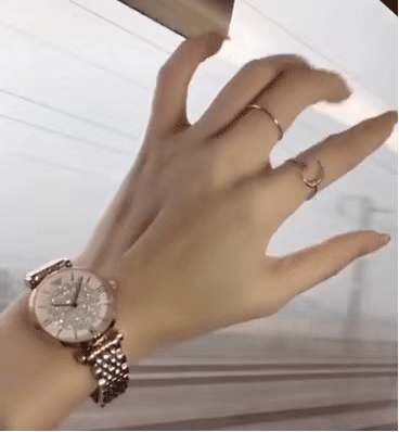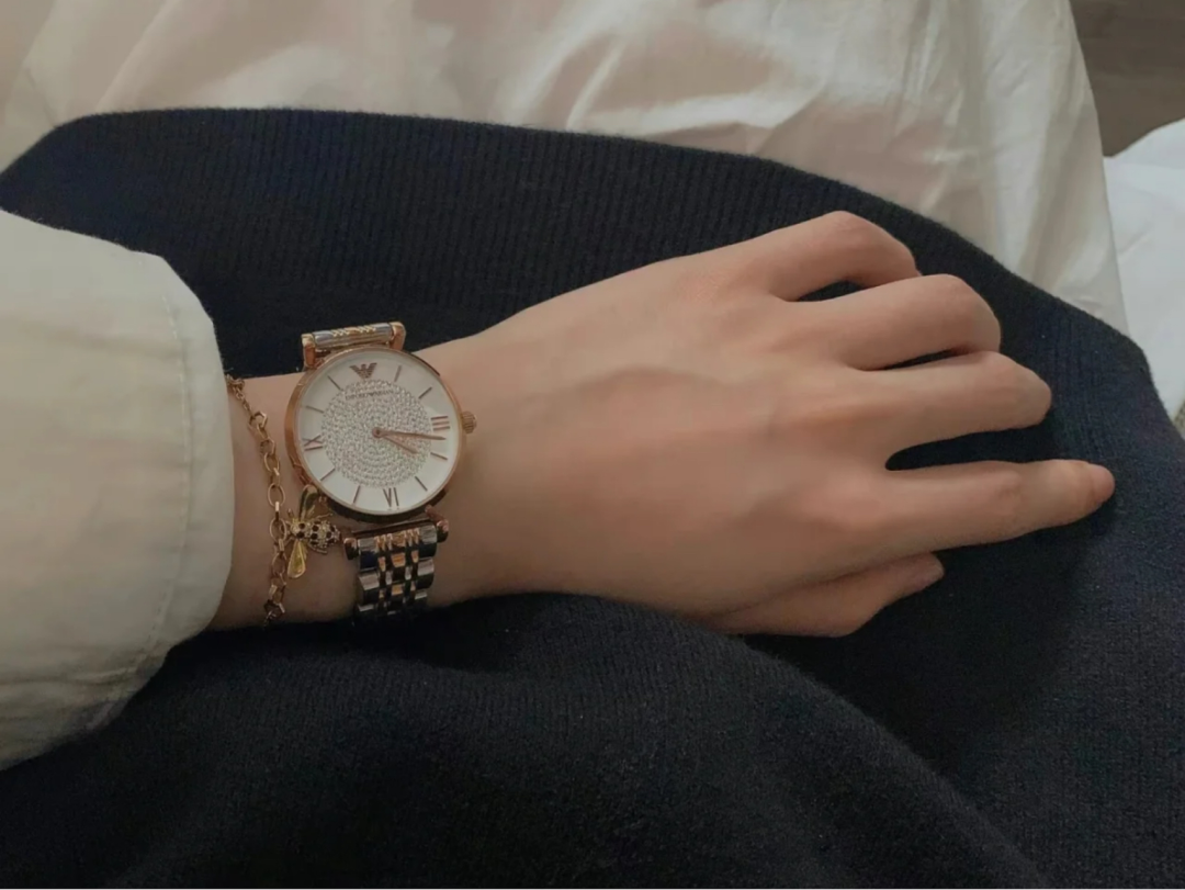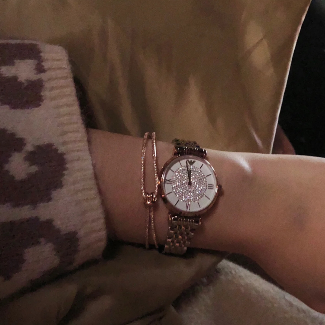 玫瑰金的外圈与水钻表盘光滑圆润,大小设计的刚刚好,正装场合撑得住场面、日常出街也不会夸张高调。