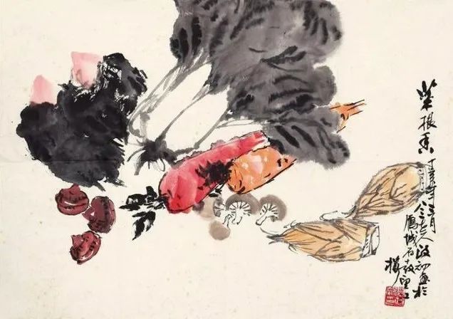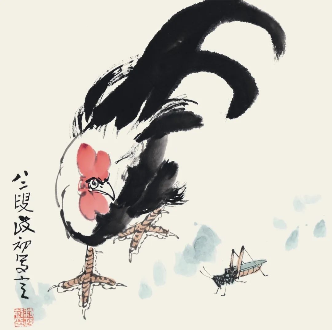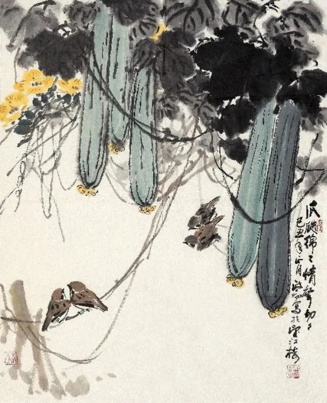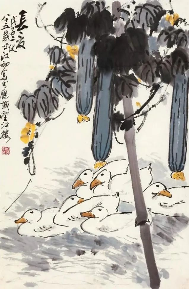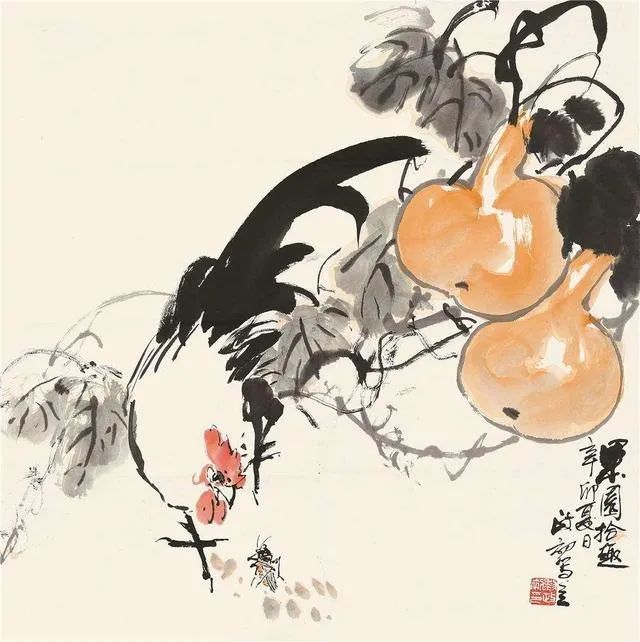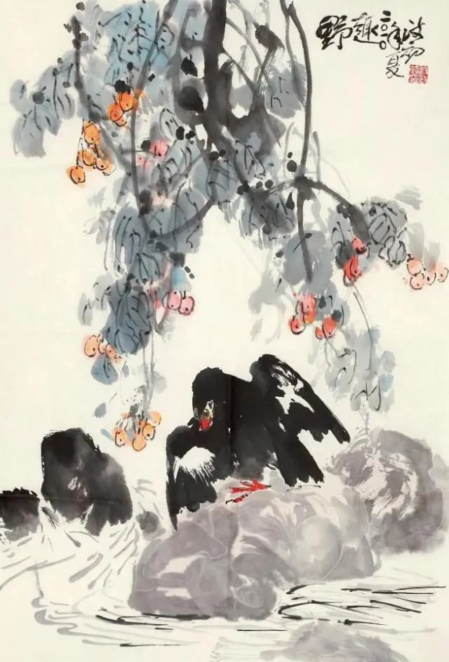 其作品既重视传统,又立意新颖。且笔墨浑厚凝重,线条老辣娴熟,用色泼辣鲜艳,洋溢着浓厚的时代气息和生活情趣。