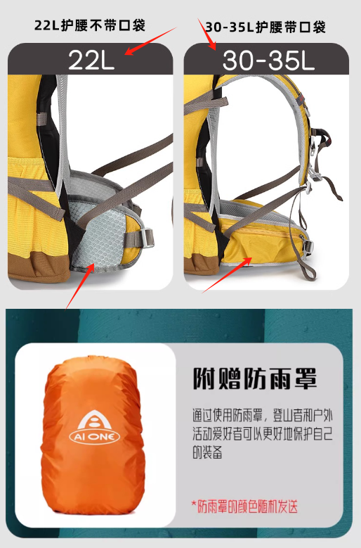 2、3D人体工学腰翼,有效转移负重,自带防雨罩。