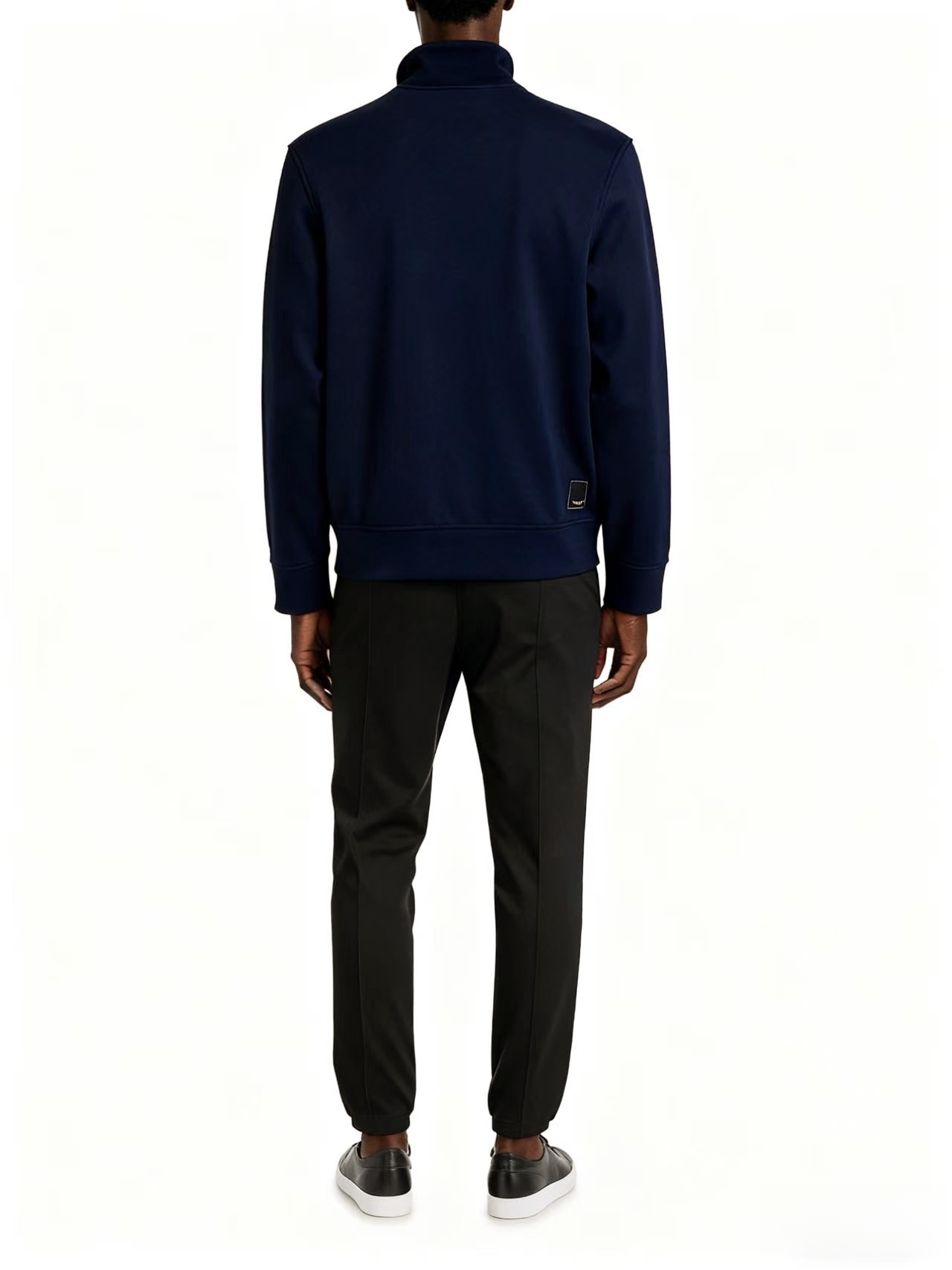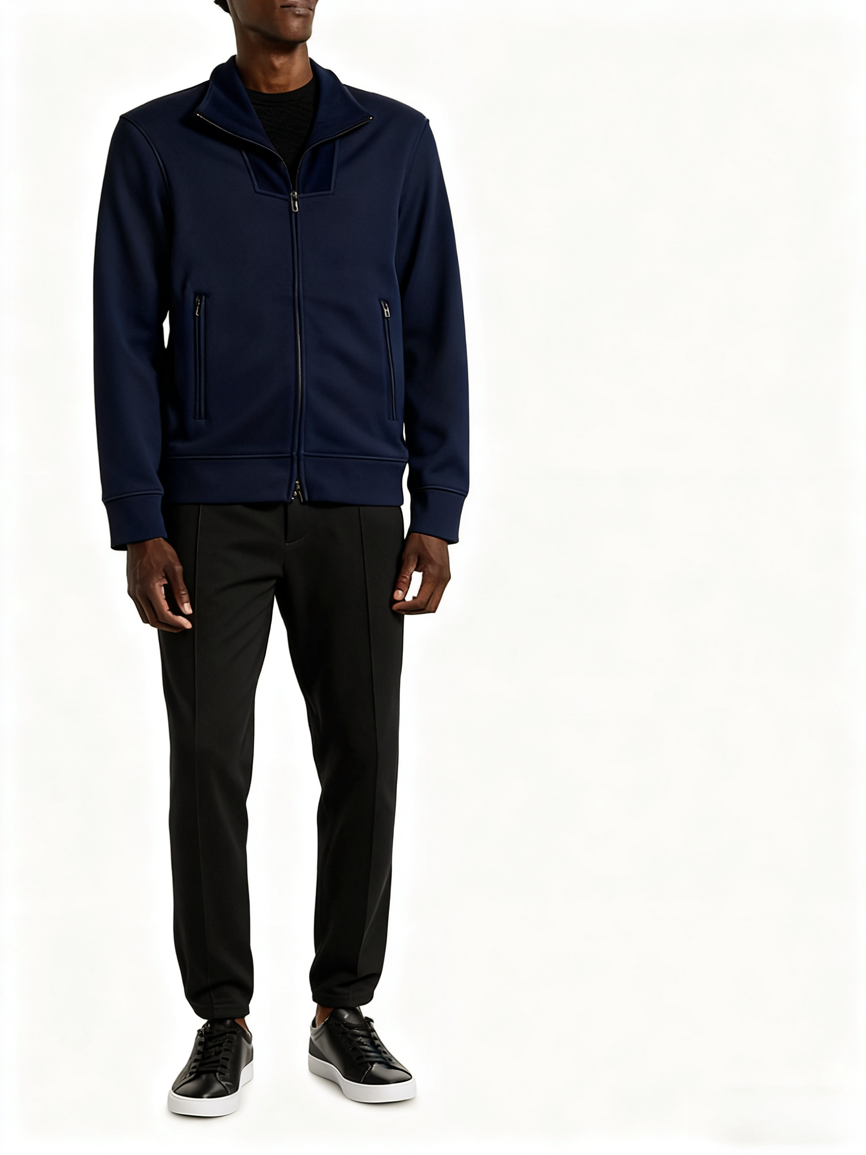 商务休闲简约纯色风格,拉链门襟,后腰皮质腰牌手工定线