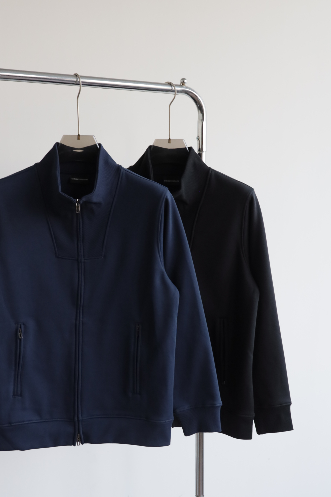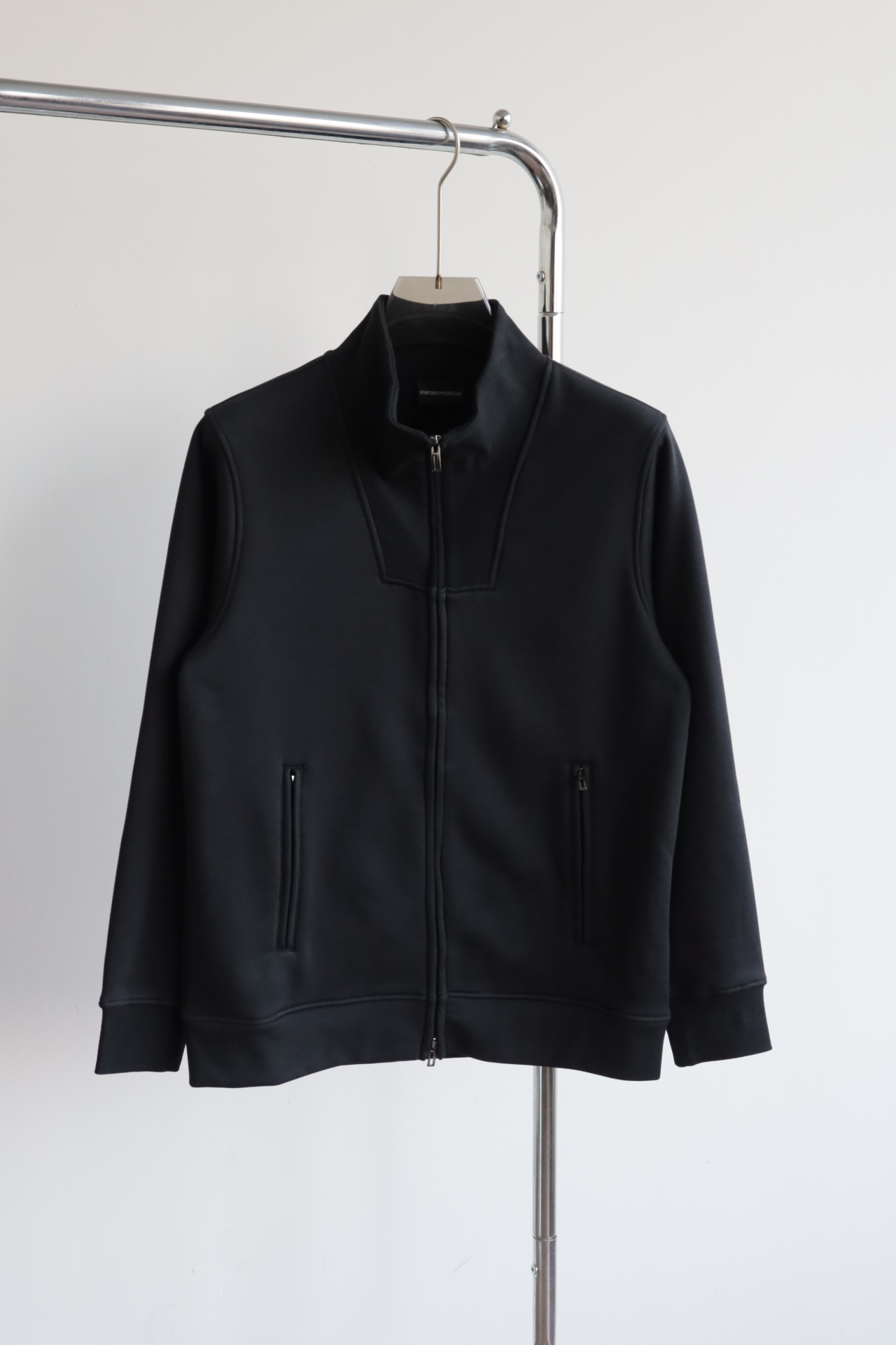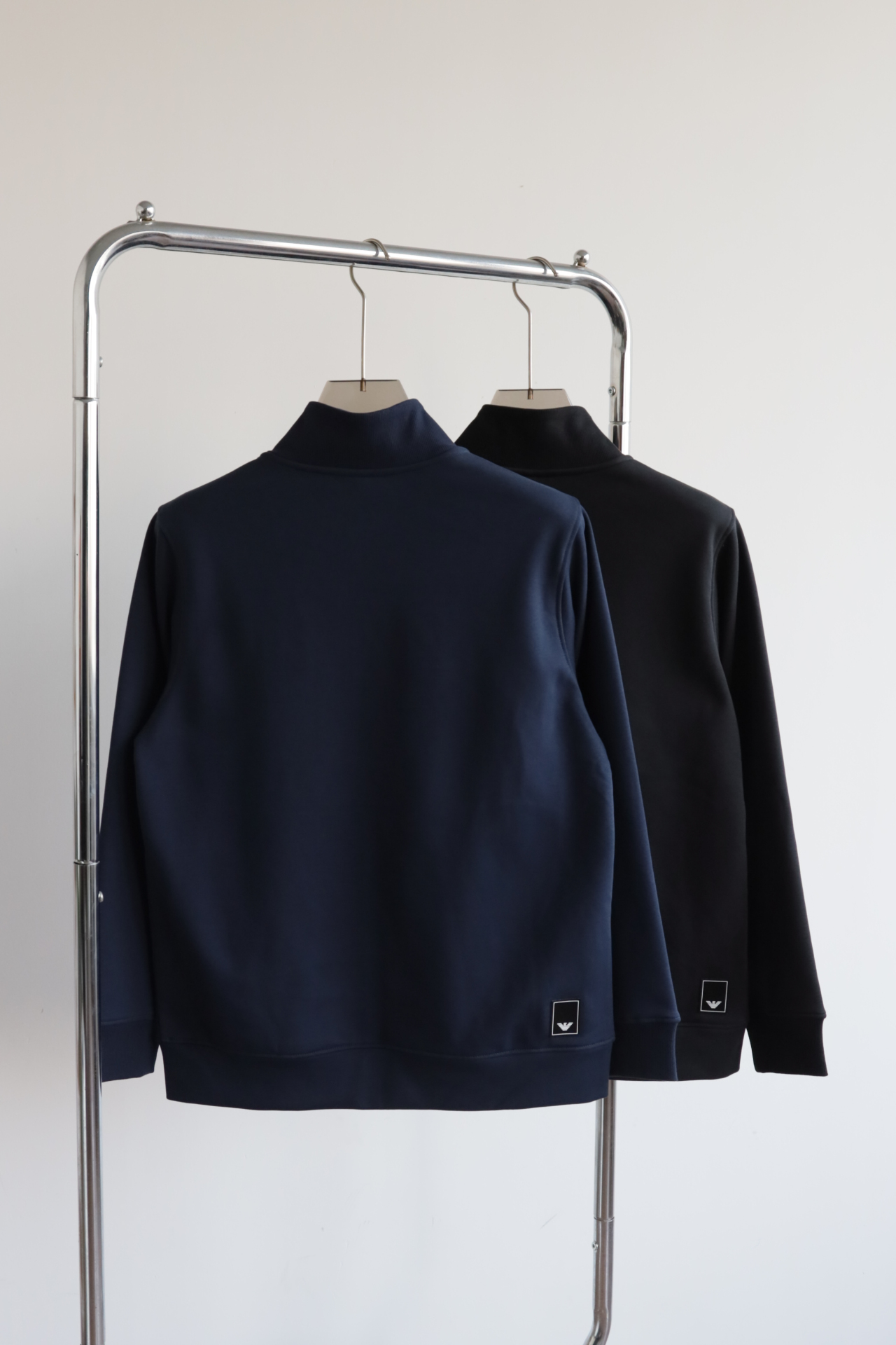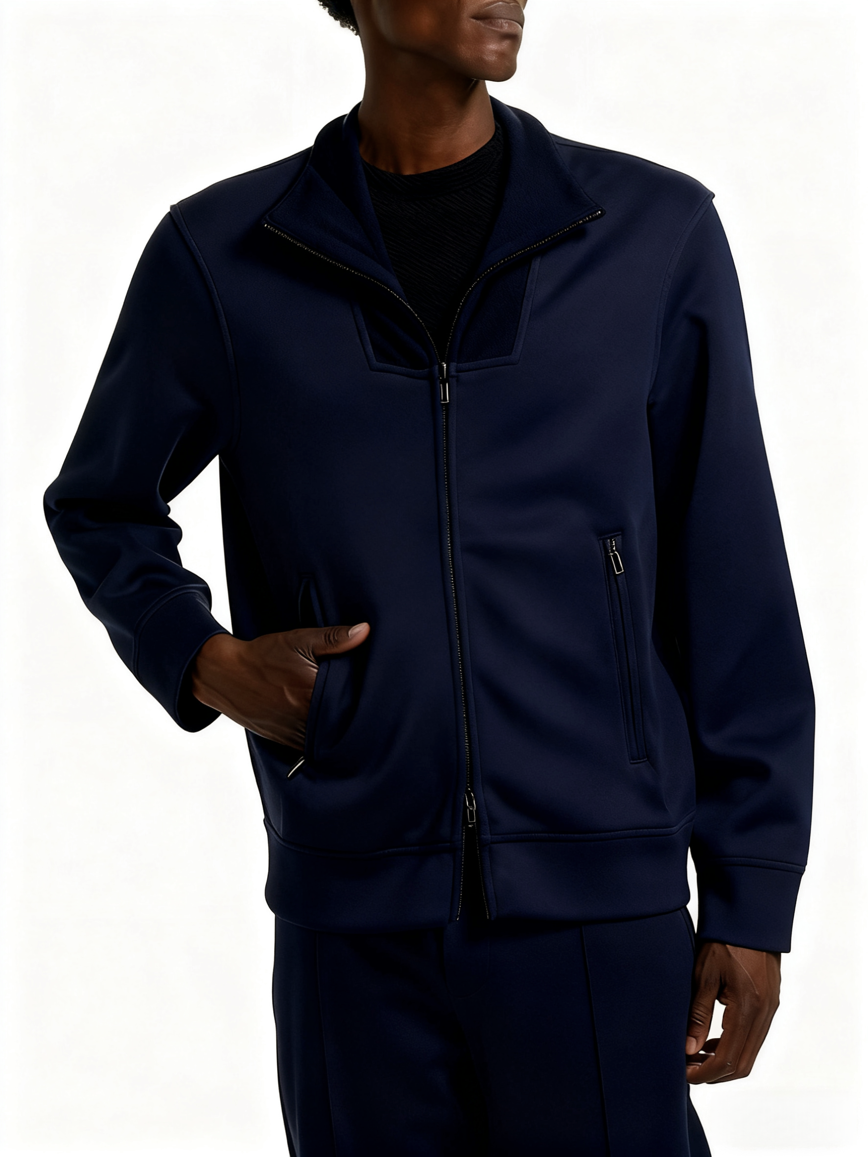 立领设计锁住颈部温度。领口拼接横纹编织螺纹