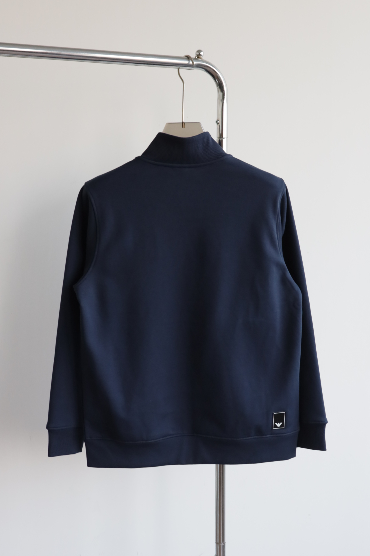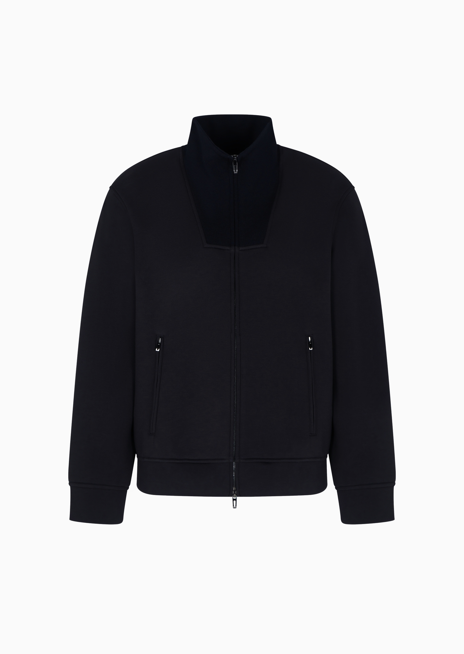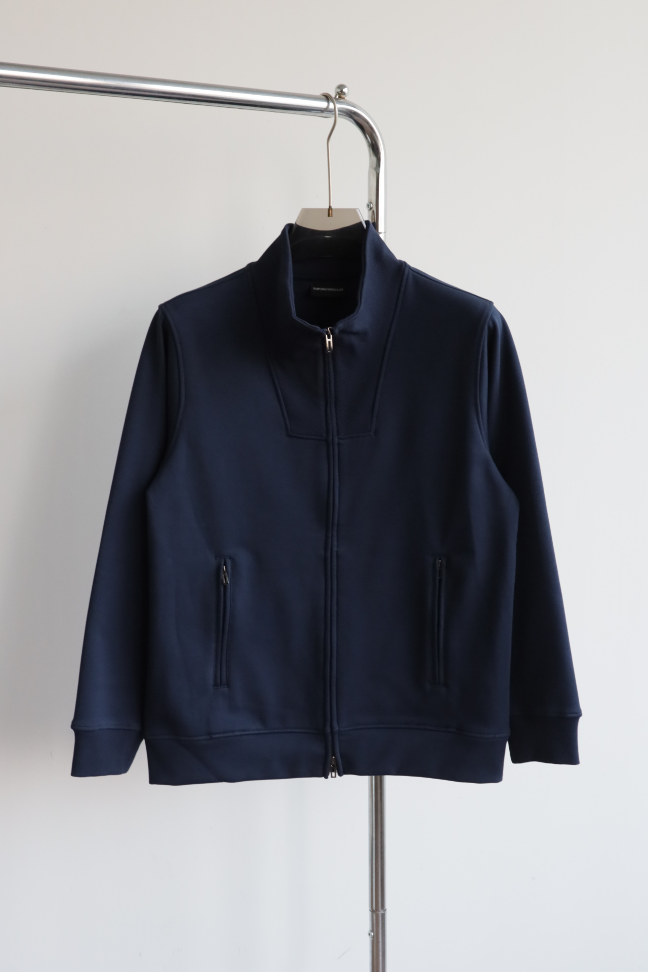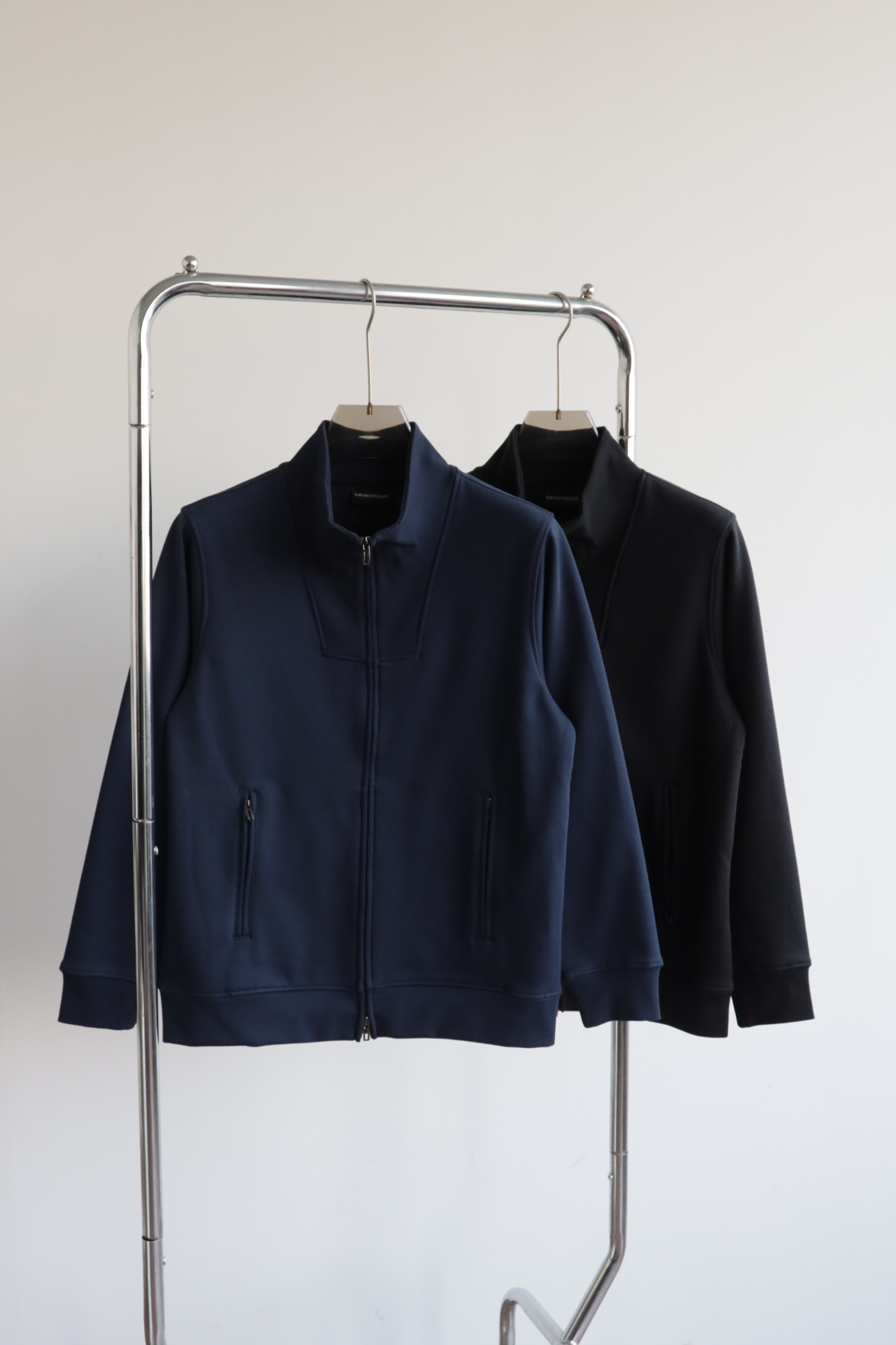 立领设计锁住颈部温度。领口拼接横纹编织螺纹