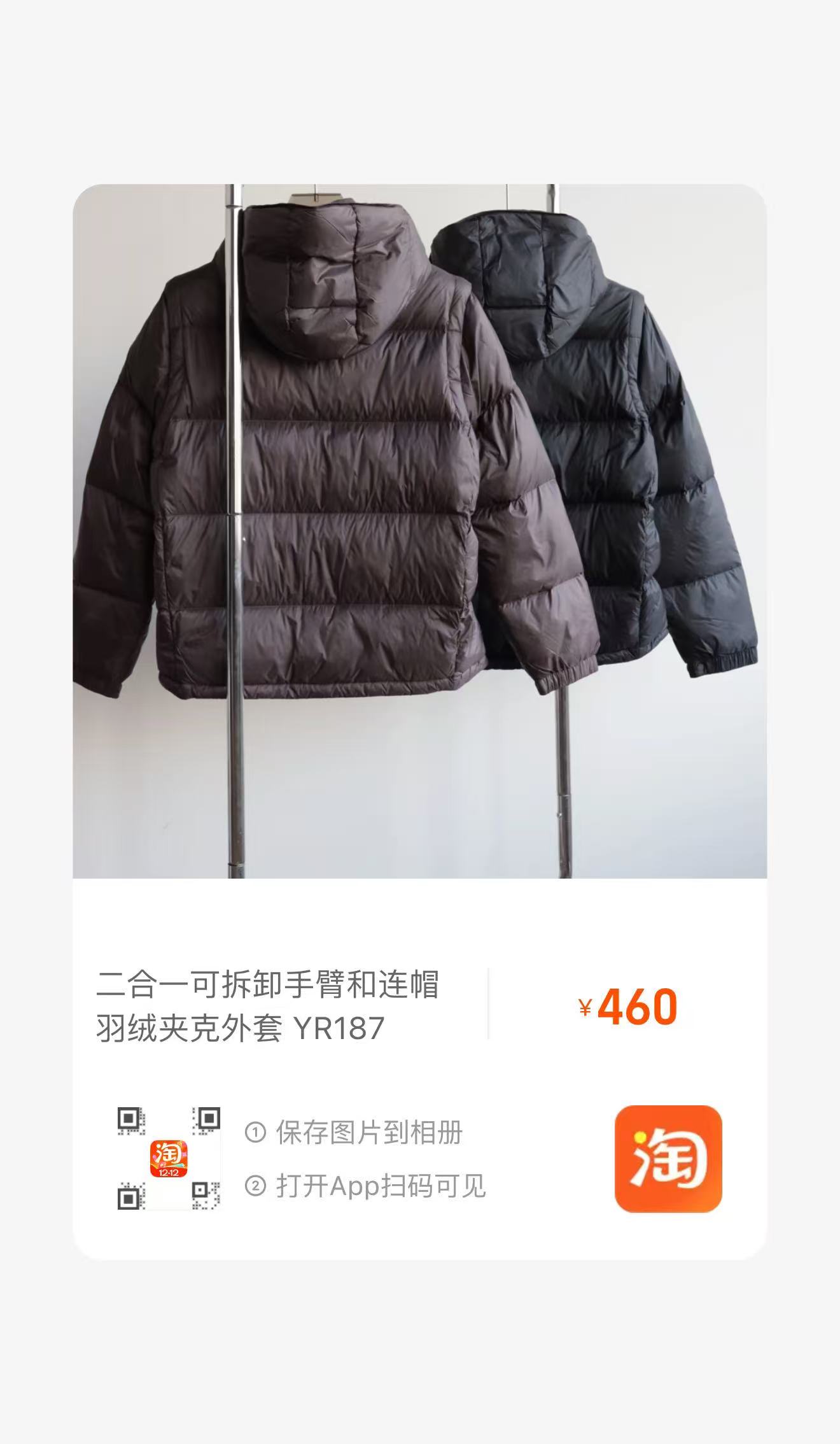 羽绒服搭配可拆卸衣袖,可作为马甲或夹克穿着。
