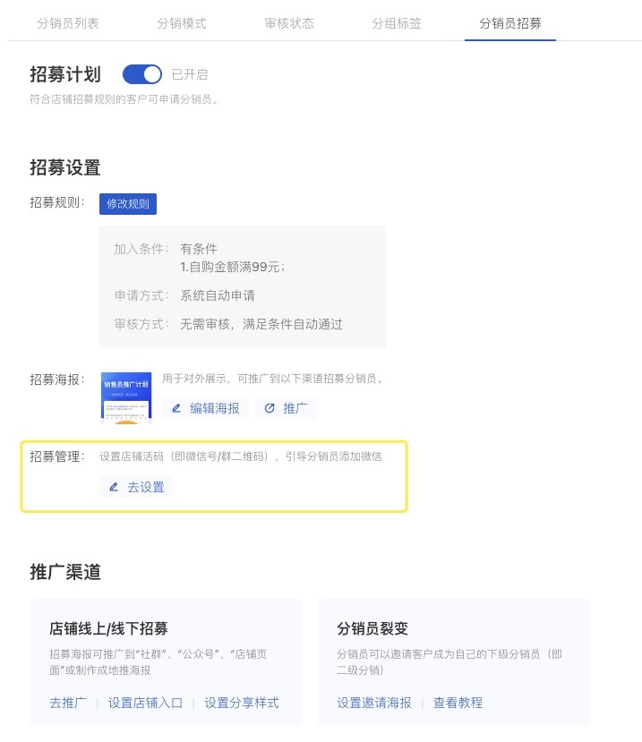 1. 分销员招募设置中,新增分销员招募管理设置入口