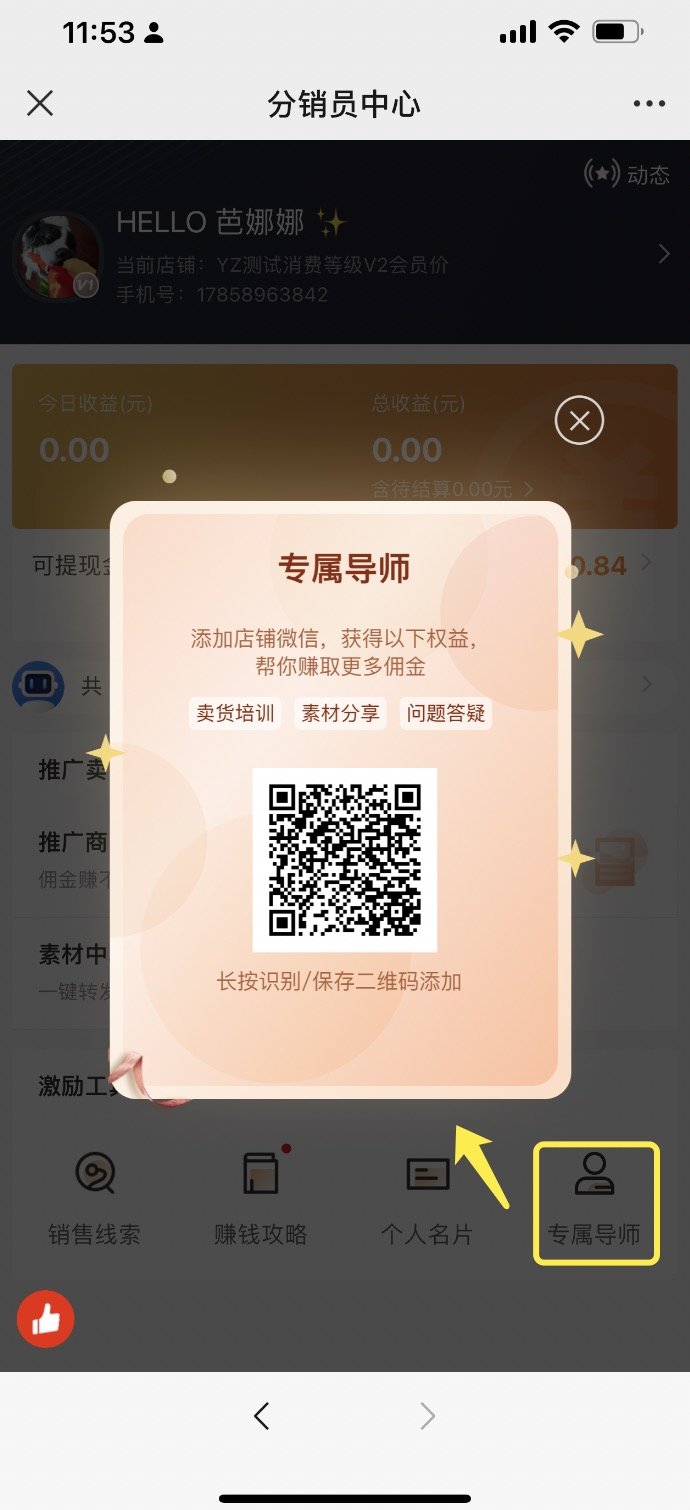 4. 针对已经是分销员的用户,商家可选择展示在激励工具侧,分销员点击分销员中心的「专属导师」时,也将会弹窗引导添加企业微信。尽可能的将店铺分销员沉淀到私域。