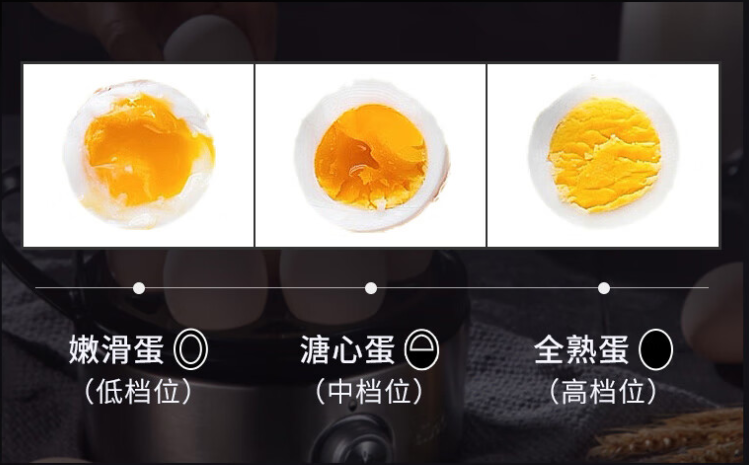 轻旋中间的按钮,即可选择鸡蛋的熟度。根据自己的喜好,不管是滑嫩蛋(8分钟)、溏心蛋(11分钟)还是全熟蛋(14分钟),都能信手拈来。