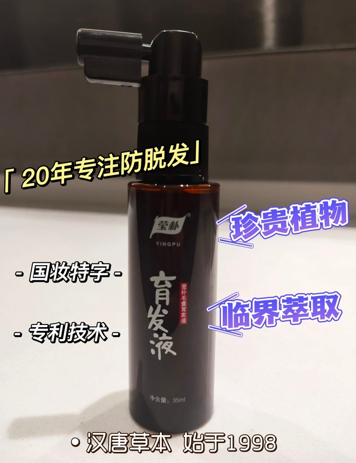 由于是纯中药植物的提取精华,所以味道是那种高级的中草药味,颜色是和碘伏一个色,按压泵头喷洒式的,用起来也很方便,是第四军医大学的科研成果,科学安全,拥有临界萃取技术,毛囊透皮吸收技术,激活头皮活性,脱发再生率达68.97%,早晚使用,而且用完是不用清洗的哦~