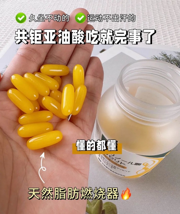 共轭亚油酸能恒久提升基础代谢率,让身体24小时都保持高消耗状态,将你体内囤积的多余脂肪通通“燃烧”。