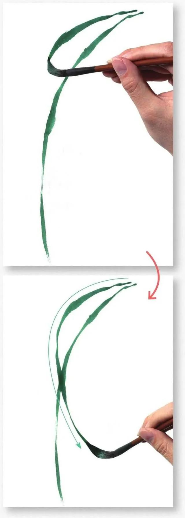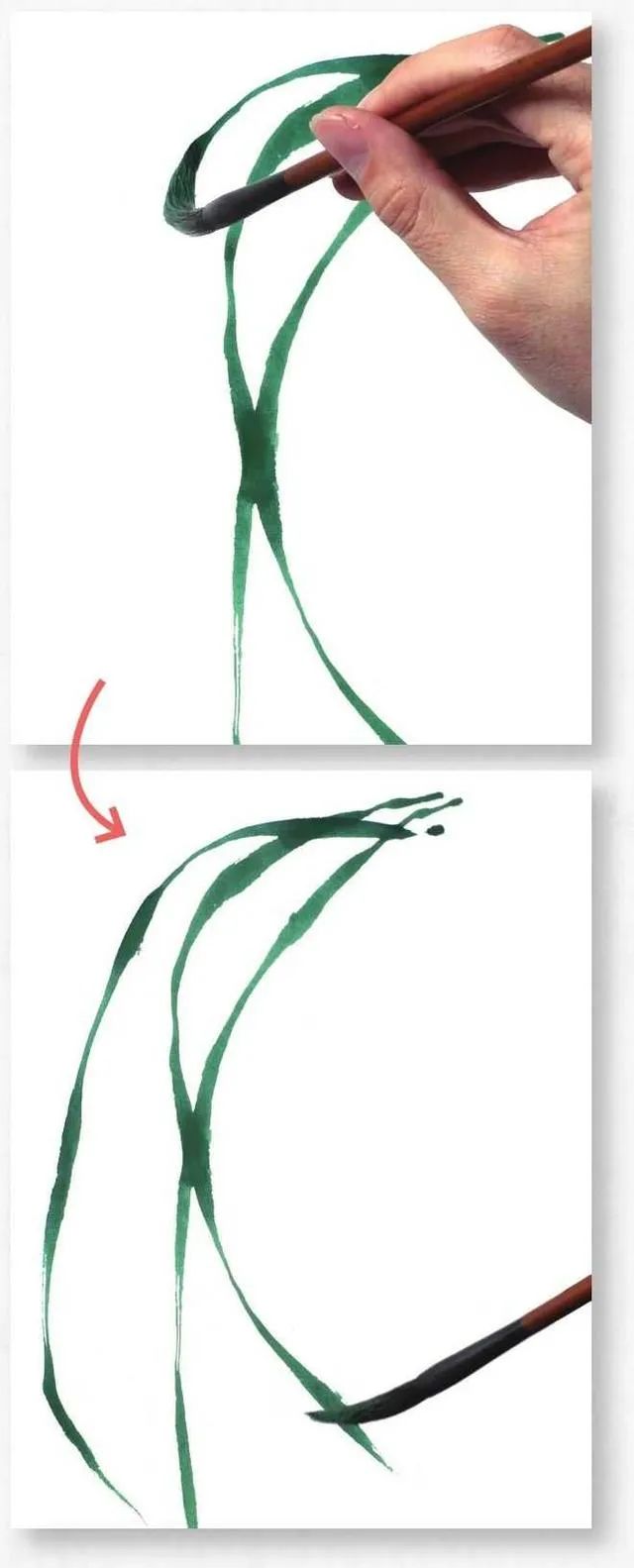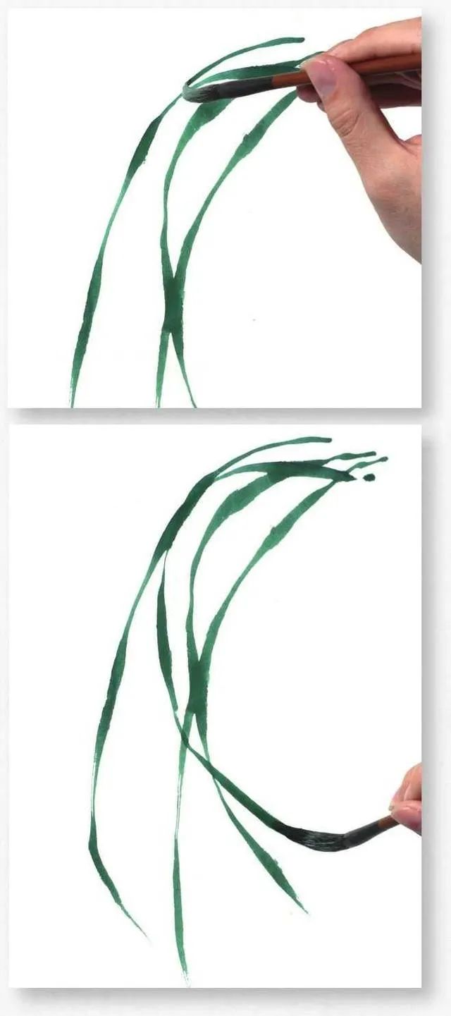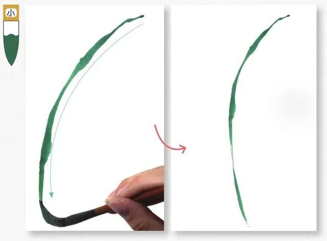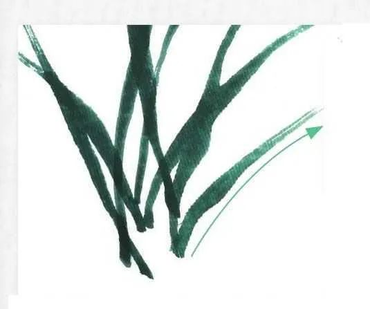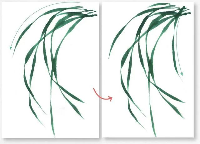 画叶有顺笔法和逆笔法,画叶丛时可顺逆结合,使叶丛层次丰富多变。4 从左向右画叶片,要表现出叶片的粗细变化,每一笔都要蕴含着轻重缓急、起伏转折和浓淡虚实的变化。