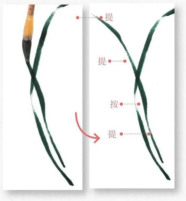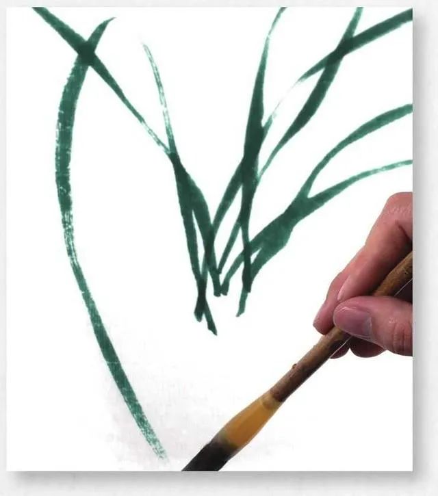 5 继续添加叶子,提笔与按笔的方向要不同,注意叶片的生长走势及姿态。兰叶要有长有短、有高有低,有节奏感,不可平齐。