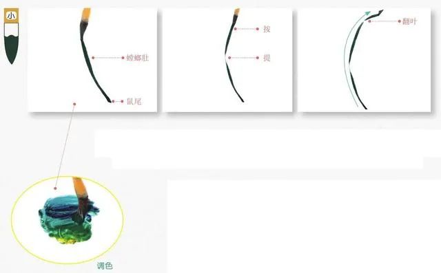 1 蘸三青和藤黄调成墨绿色,用顺笔法,中锋运笔勾勒出叶片,注意行笔要有提按,速度要有缓急。