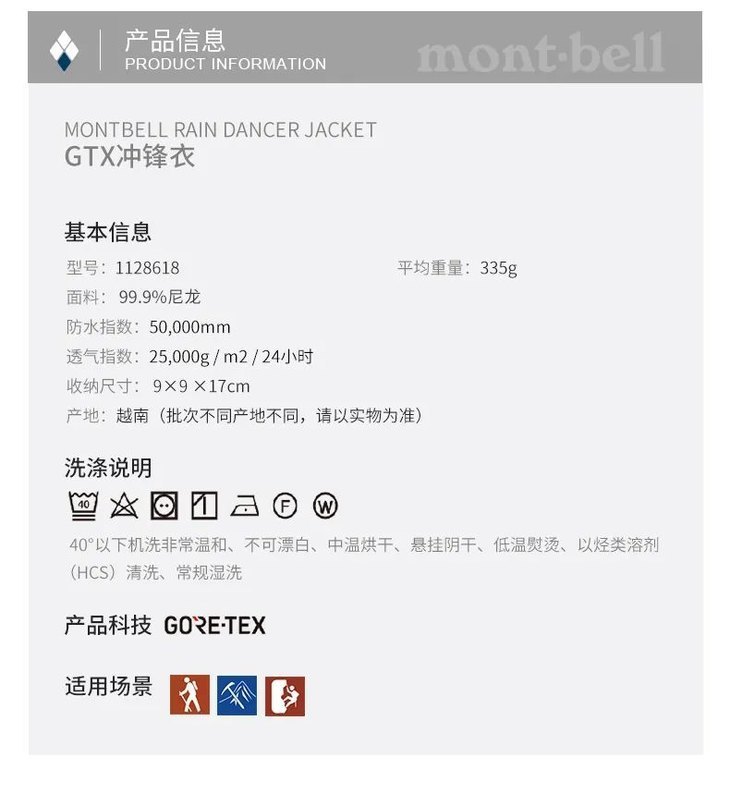 Mont-bell Raindancer 雨舞者男女GTX冲锋衣裤