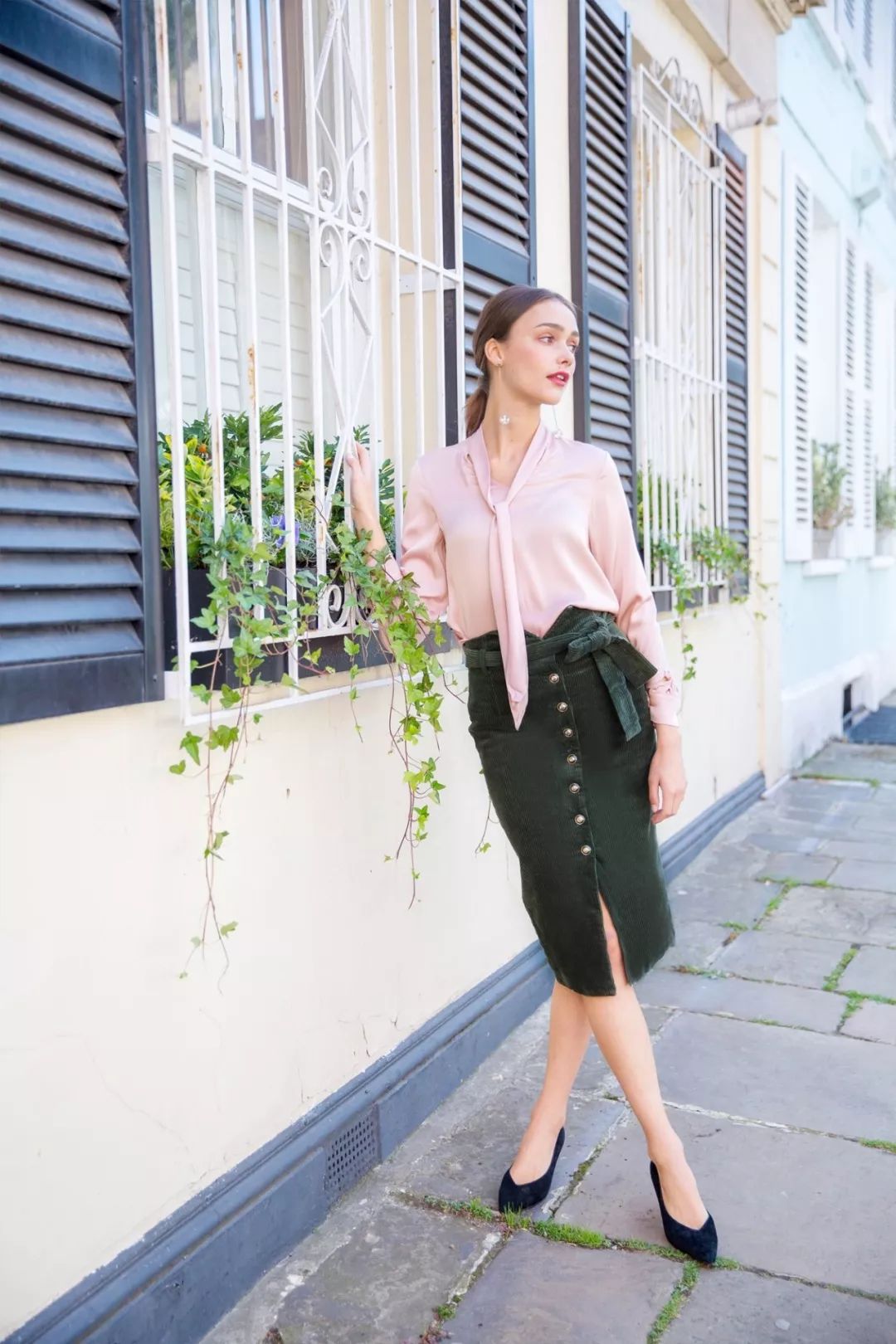 灯芯绒超流行,墨绿色的更是复古气质翻倍。这条半裙是经典的绿金配色,纽扣是做旧的古铜金色。