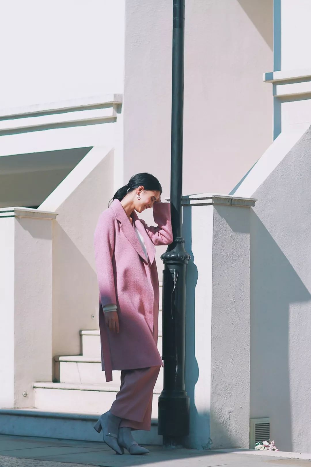 模特这身搭的就是上面说的干枯玫瑰粉衬衫,我自己也很喜欢这一身,一点明一点暗,一点硬一点软。▼