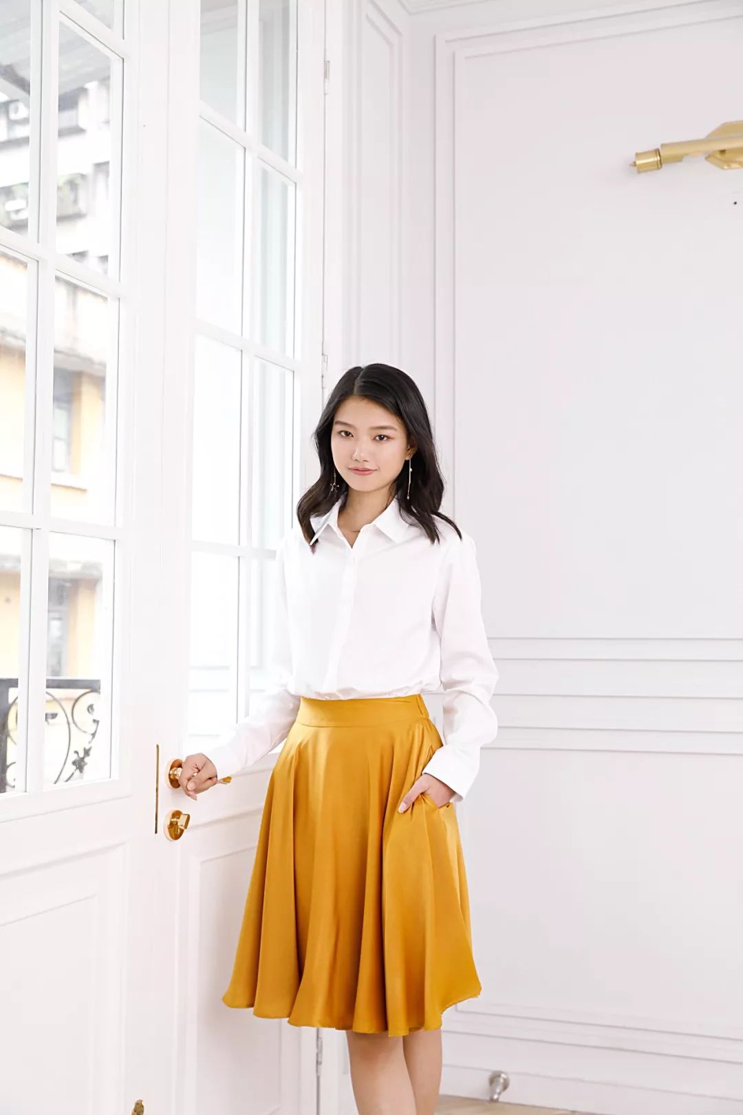 下半身的选色,决定着整个造型会不会很沉重,姜黄色半裙就很容易让人眼前一亮,活力满分。