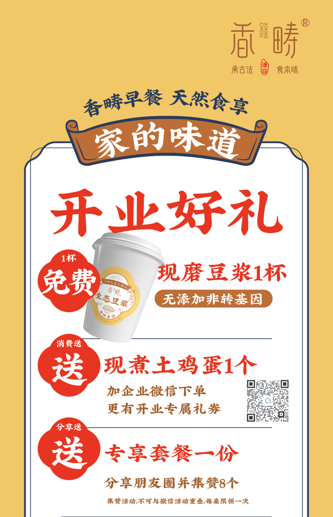 6月4日,香畴早餐店正式开业,感恩邻居们在香畴不成熟期间,对于出品的包容,所以为各位特别安排了一系列与邻居们同庆开业,感恩支持的活动。🎉 分享朋友圈,集赞8个,可以免费领取专享套餐1份立即扫码入群,领福利
