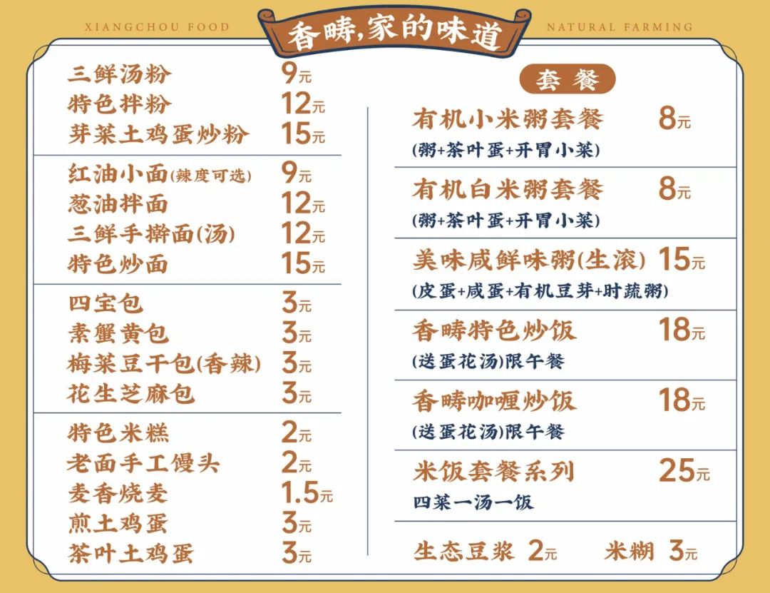 事实上,香畴早餐店的价格很接地气,比如:一杯生态豆浆只需2元;滋养身心的有机小米粥套餐只需8元,食材丰富滋味浓郁且健康的三鲜汤粉只需9元就能吃到一大碗!可能还有邻居会觉得:食材这么好,还无添加,这么便宜怎么可能,一定是假的吧?和其他家餐厅的食材靠采购不同,香畴早餐店背靠谦益农场天团,90%以上的食材都是自己人亲手种植,所有的食材种植期间不用任何农药化肥除草剂,通过SGS等各种农残检测。谦益农场创办于2009年,创始人李明攀不足16岁考入华中科技大学,毕业后成为跨国企业的手机芯片设计师。多次赴美进修的他,在业内拿奖拿到手软,是业内的技术尖子,曾有别的团队解决不了的技术问题,他花了三天就搞定。2008年,因为个人身体原因,辞去年薪30多万的工作,回乡种田,至今已有十三年,在自然农法生态圈小有名气。农场自己种的食材,不仅比外购有机食材靠谱,成本也可控,尤其是初衷简单,就是想让大家品尝到健康又平价的餐食。点击了解→小麦种植基地负责人杨越寒