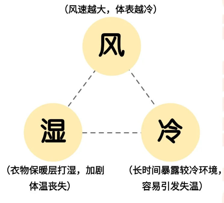 潮湿(如淋雨出汗浸湿内衣)和大风天气下,也可能因“风寒效应”和“水冷效应”导致热量急剧流失引发失温。