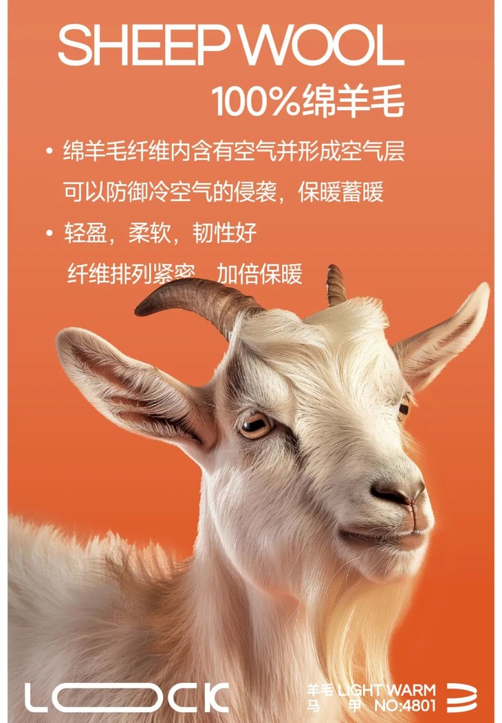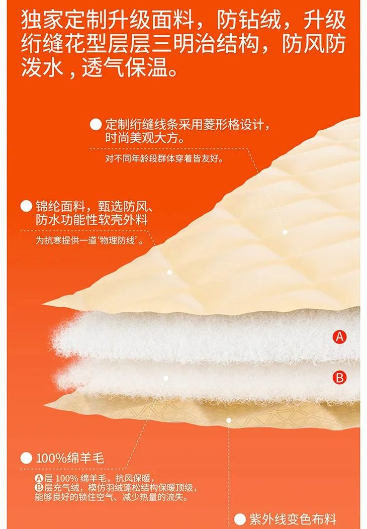 填充100%绵羊毛,形成的空气屏障能有效阻挡冷空气的侵入。
