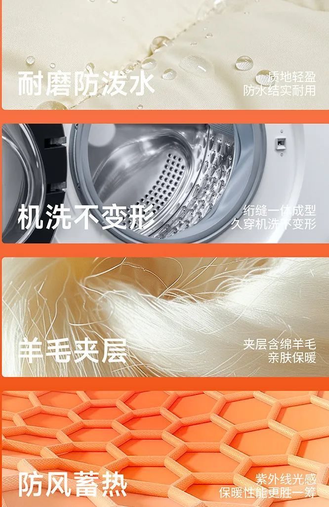 外层用的是科技防泼水防风防寒面料,冷风钻不进来,热量吹不走。