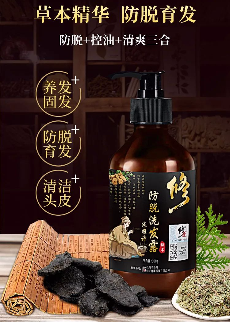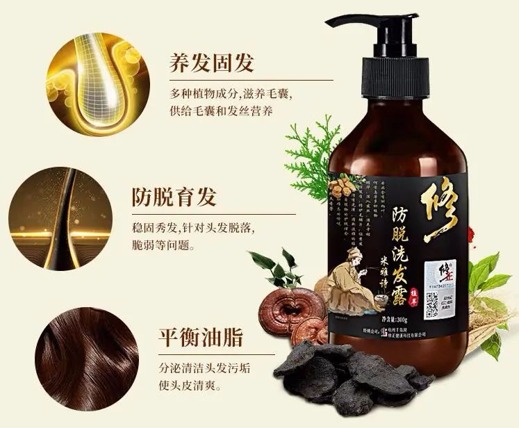 修正黑灵芝洗发液,采用五大植萃黑发配方,利用长白山野生黑灵芝,配上云贵高原何首乌、长白山野山参,当归、黑桑果等,补充发丝营养,促进白发转黑发。