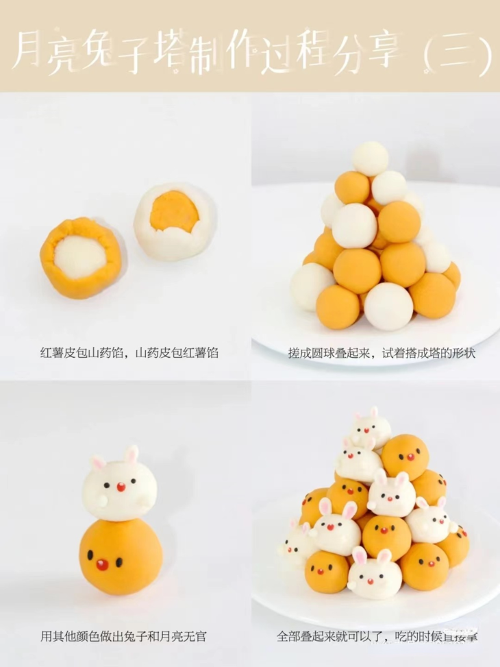 中秋节来啦,小宝宝也要拥有专属可爱小月饼呢,今天特地为小宝宝准备了营养美味又健康的迷你月饼,这款兔子月亮塔,把月亮和兔兔堆在一起,太可爱啦!