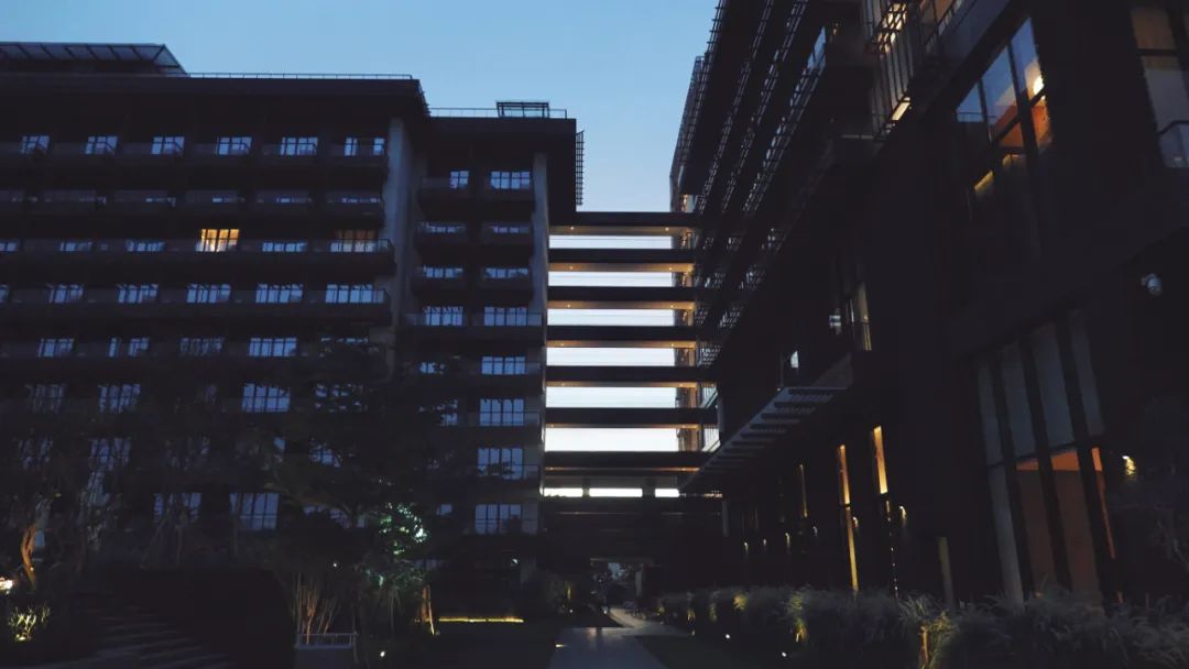 ▲落日余晖穿过酒店建筑▲