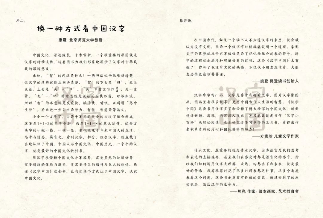《汉字中国》这套图书所演绎的,是当我们看到一个汉字,大脑应该如何思考,如何产生脑电波,如何将智慧的先民所面临的环境、问题和解决办法联系起来看。 如果不能看到汉字背后的文化,不能看到汉字里蕴藏的思维力量,那么即便拥有世界上最古老、最独一无二的文字,也不值得人们骄傲。