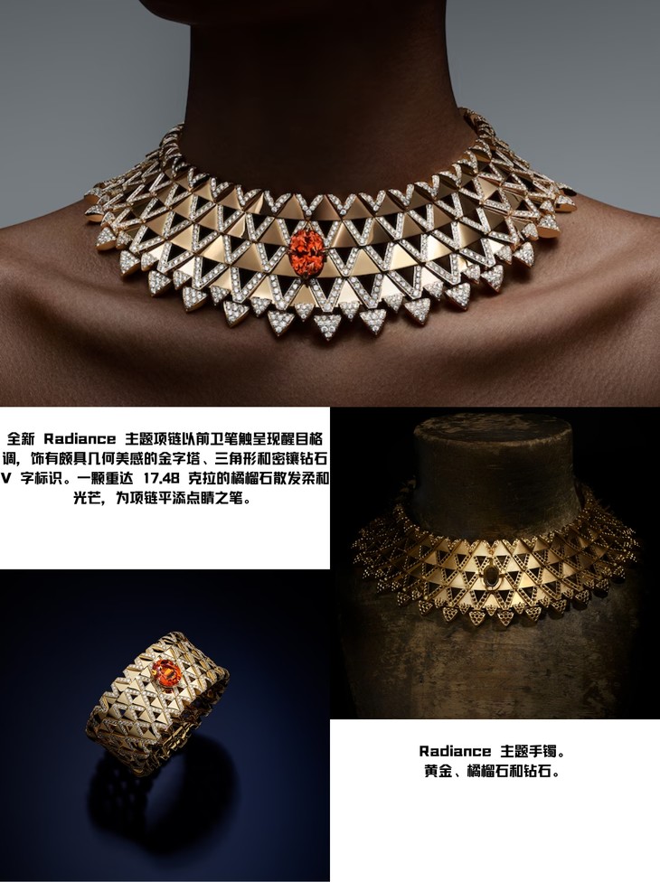 📿全新Radiance主题项链,前卫笔触勾勒出醒目格调。金字塔、三角形和密镶钻石V字标识,几何美感跃然颈间。17.48克拉的橘榴石柔和光芒,为整体造型锦上添花。🌹