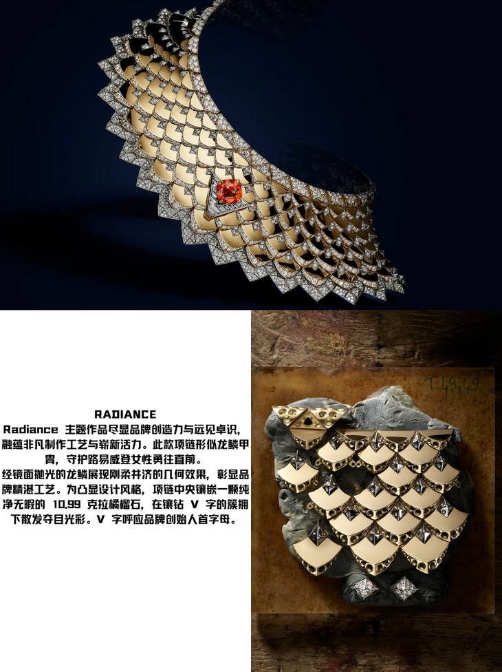 🌟 龙鳞甲胃的守护,路易威登女性勇往直前!这款项链,刚柔并济的几何效果让人一眼难忘。中央镶嵌的10.99克拉橘榴石,在镶钻V字的簇拥下,犹如星辰般熠熠生辉。💫