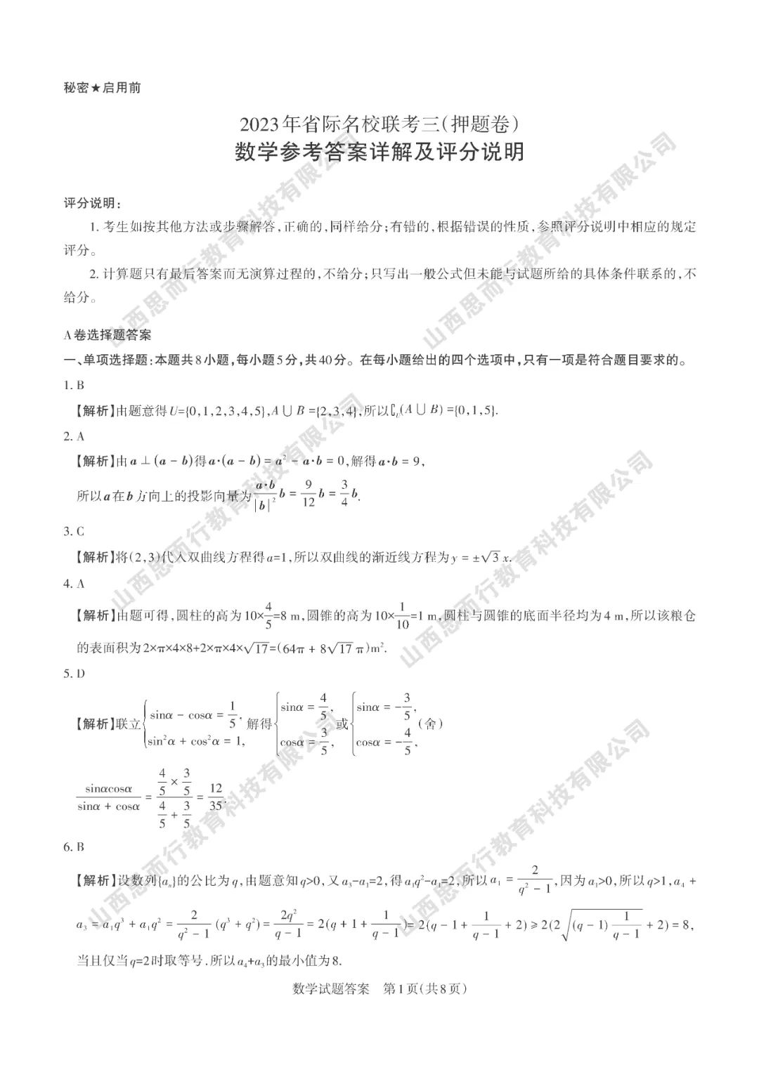 2023届高三山西省际名校联考三语文数学试题及答案
