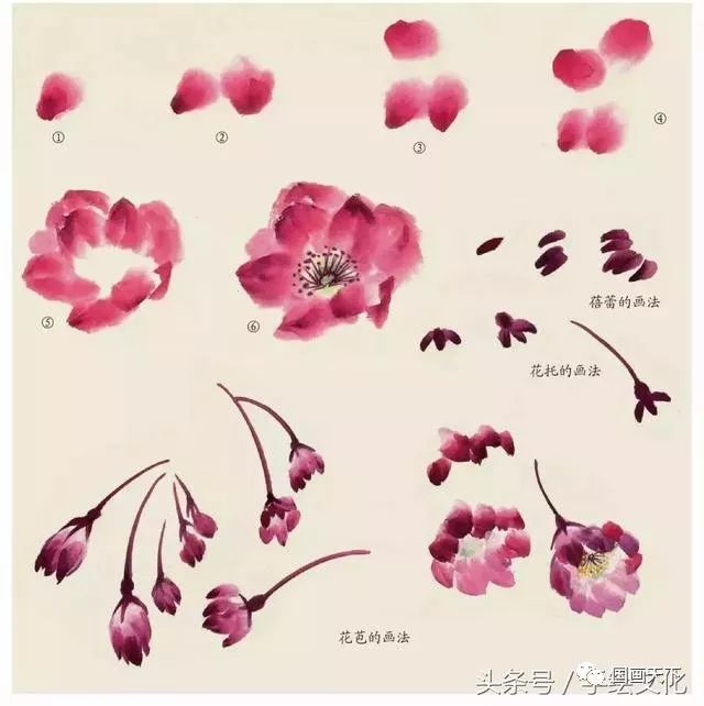 花的画法:用白云笔调稀状白粉,笔尖蘸胭脂以点厾法画出,花瓣的颜色、大小要有变化(否则宜平),以淡汁绿染花心。用狼毫叶筋(或衣纹)笔调胭脂(或墨加曙红)勾花须。用稠粉黄(钛白加藤黄)点花蕊。