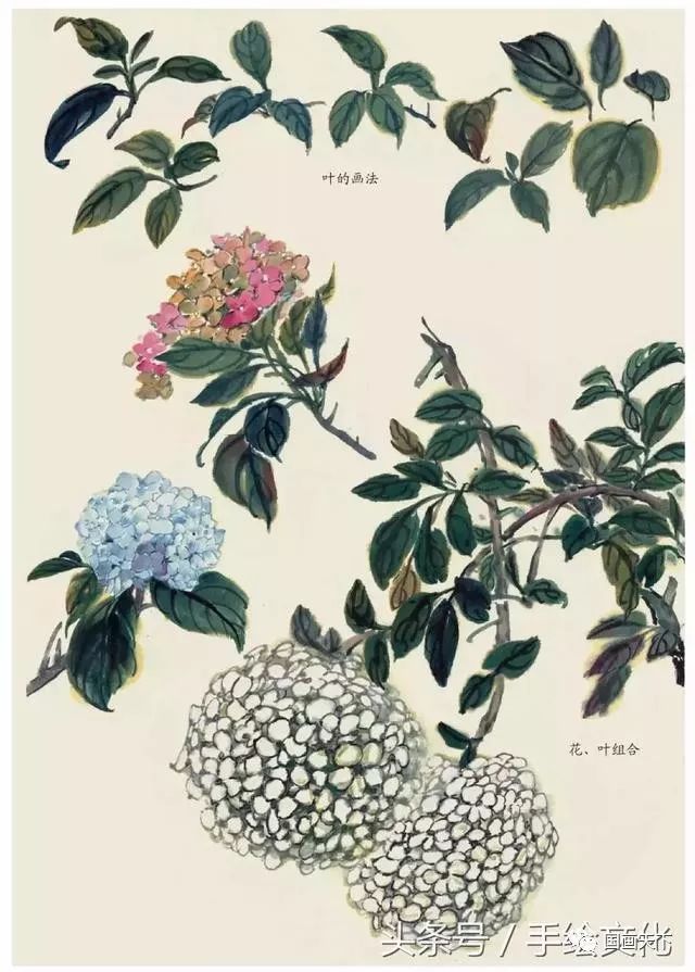 叶的画法:笔调汁绿蘸花青(或墨)写出,也可用浓、淡墨色勾写。