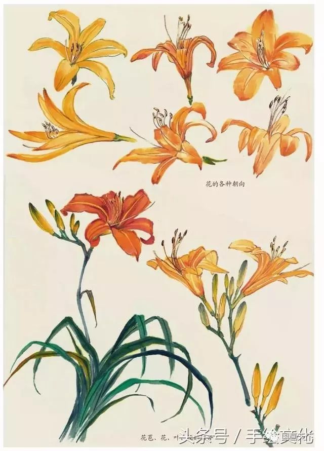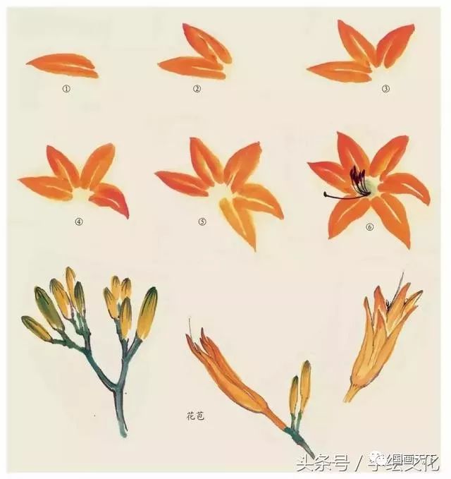 花的画法:笔调藤黄加朱磦色,笔尖蘸浓朱磦,从花瓣基部向外点写出大小不同的六瓣,花心部留白,趁未干时点勾花蕊。