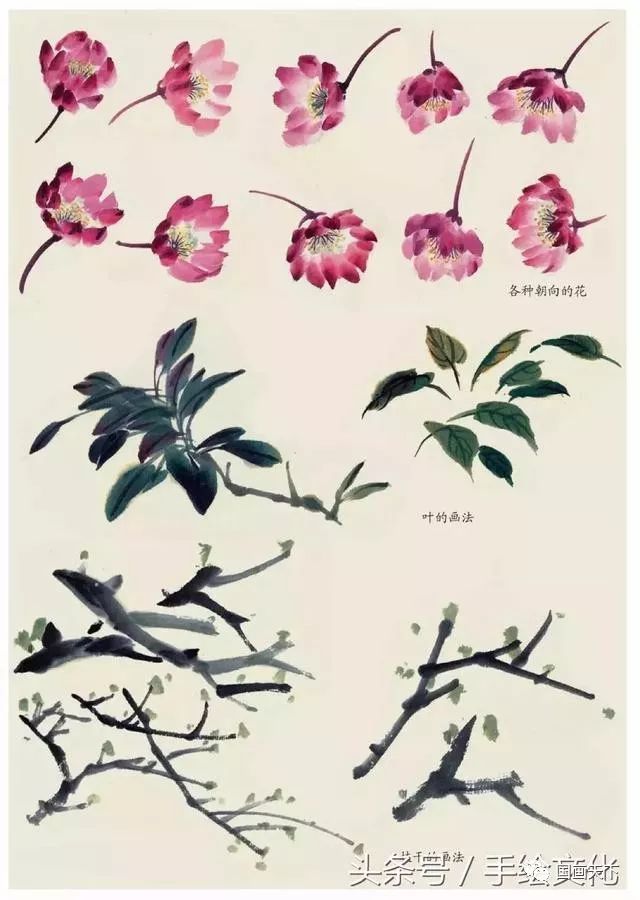 叶的画法:笔调藤黄加花青成汁绿色,笔尖蘸花青(或墨),以中、侧锋写出,随着笔中颜色渐淡,画出的叶也有变化。嫩叶用笔尖蘸少许曙红(或朱磦)画成。
