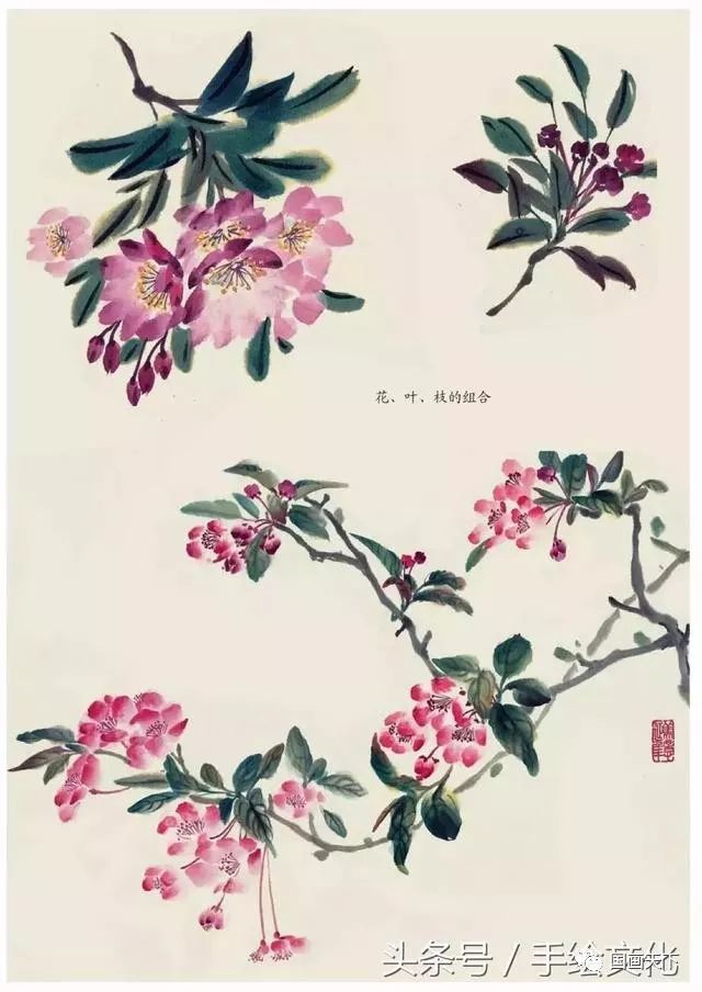 花、叶、枝的组合:注意主次和颜色的浓淡。淡色花以重色枝叶衬,枝干要取势,穿插有致,叶要有聚散、虚实变化。