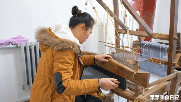 通过投梭的形式,使羊绒纱线经纬交织,随着木头纺车“嘎吱嘎吱”的声音,一条厚薄匀称、宽窄统一的围巾就这样诞生了。