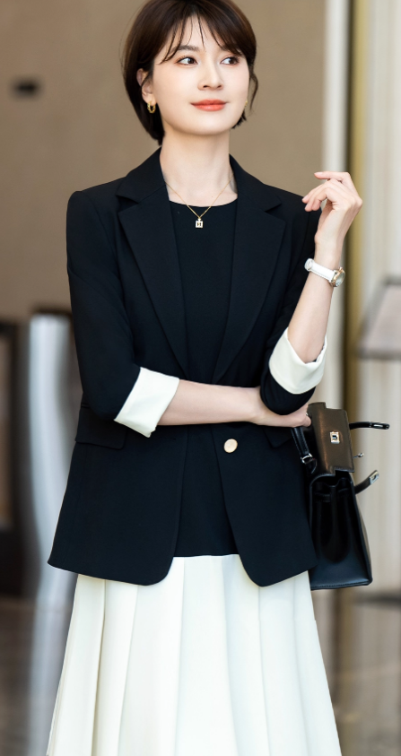 ✨外搭一件黑色西装外套,瞬间气场全开,七分袖露出白色内衬,细节处尽显巧思,通勤时穿,专业又时髦~