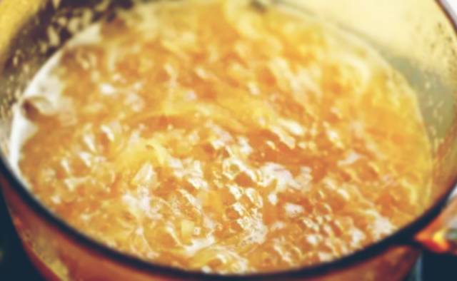 2、把腌渍好的柚子皮丝与果肉放入锅中,煮开后小火熬煮40分钟,有选配食材,此时一同加入;