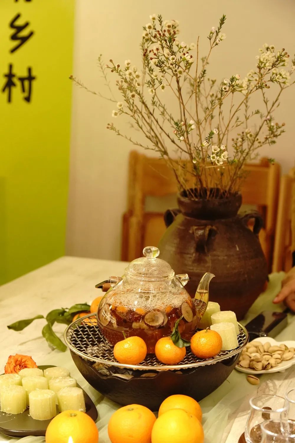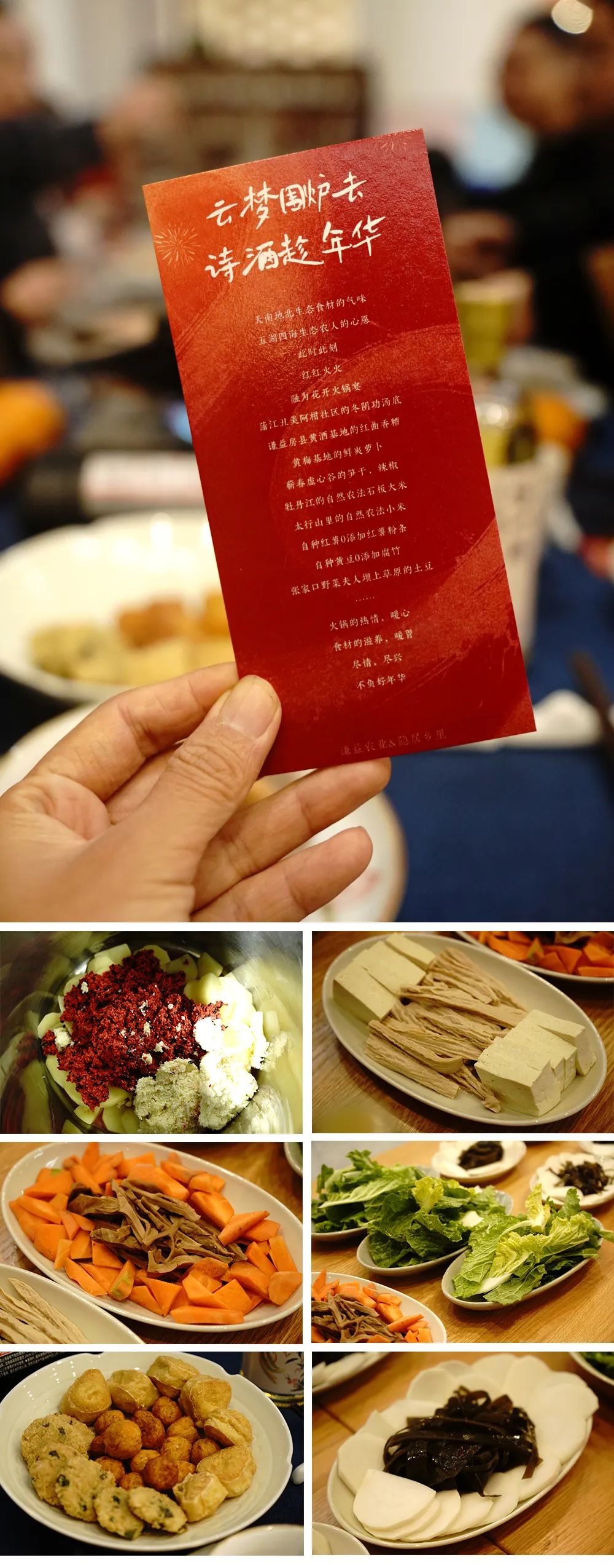 这次我们提升了鲜美感及食养配料。农场的芸豆、生态同行野菜夫人的土豆、房县黄酒厂冬酿的干型红曲酒醪、现做豆腐留下的豆渣,熬煮了约3小时,以此素汤兑入化开的冬阴功底料,橘香含醪香,汤色橙红相染,温暖的火锅,满满荡荡。