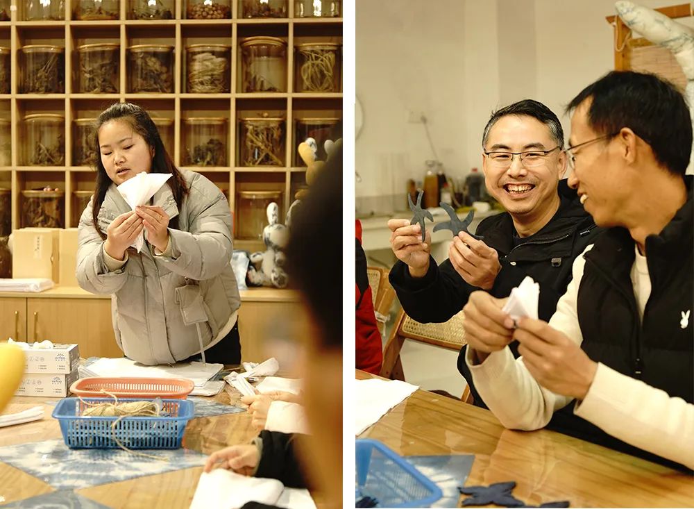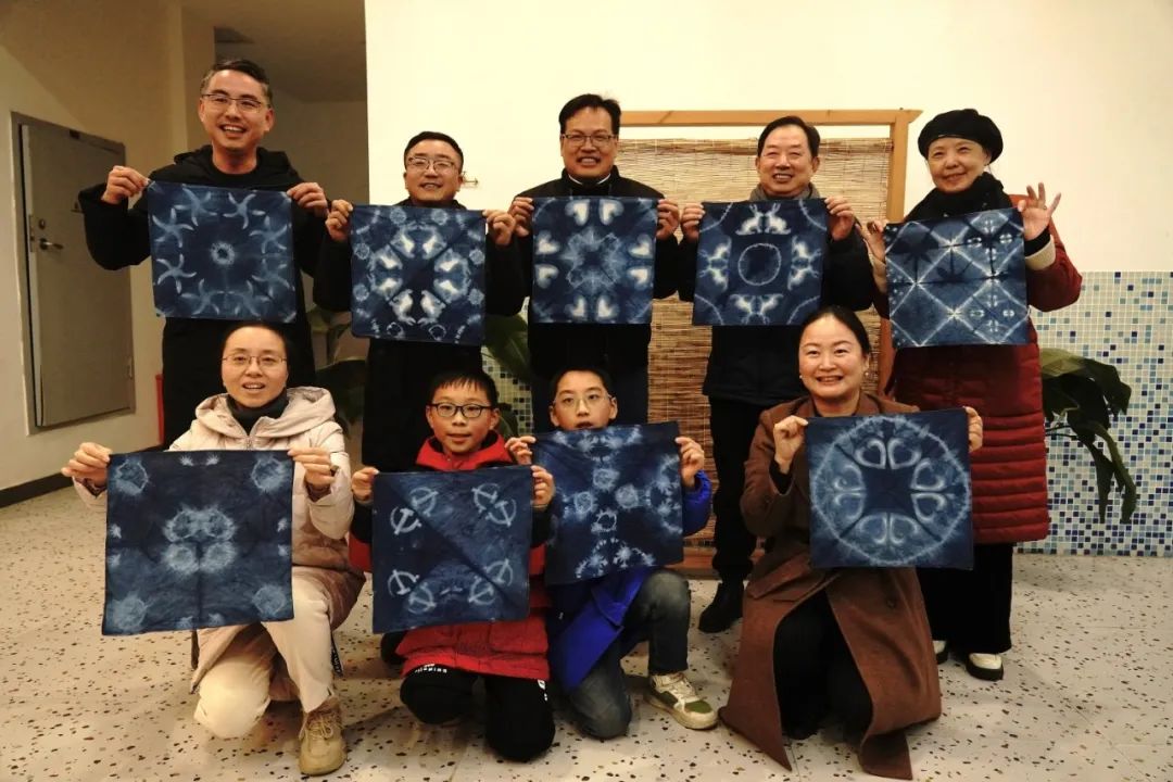 下午嘉宾到来,我们先去扎染坊跟随老师染手帕。用雪糕棒、兔子、蝴蝶等造型木片,绑扎在白布上,就可以保护手帕不被蓝靛泥浸染,从而呈现白纹图案。