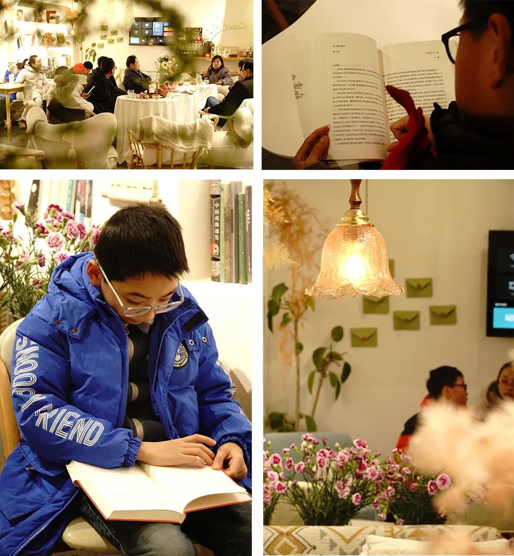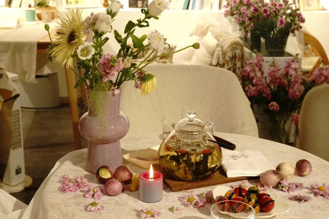 推门走进楚楚咖啡馆(围炉夜话处),精致的布景、温暖的氛围,瞬间吸引了大家的目光,场景太美,不由地举起手机拍照。茶点、水果、音乐、鲜花、蜡烛、书……早已经备好,只等大家到来。