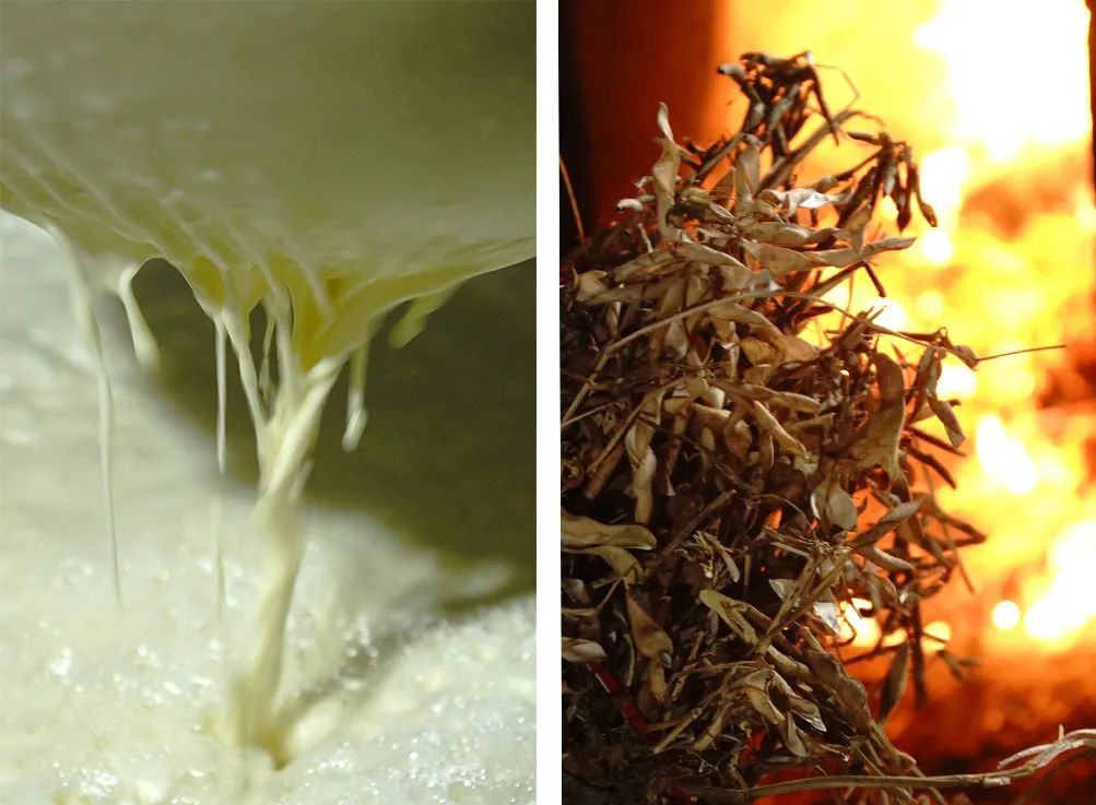 豆子提前一晚泡好,磨浆过滤,倒进柴火灶上的大锅里。老师傅守着灶边添柴,豆杆和稻草烧得火苗呼呼的,温暖着隔着铁锅的豆浆,“煮豆持作羹,漉豉以为汁,萁在釜下燃,豆在釜中泣……”古人的诗在此刻有了具象化的场景。