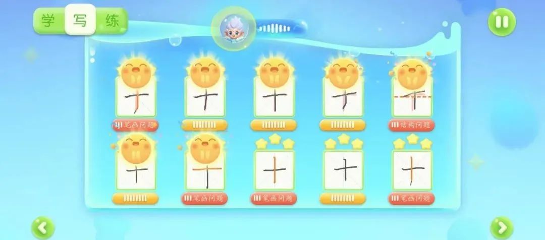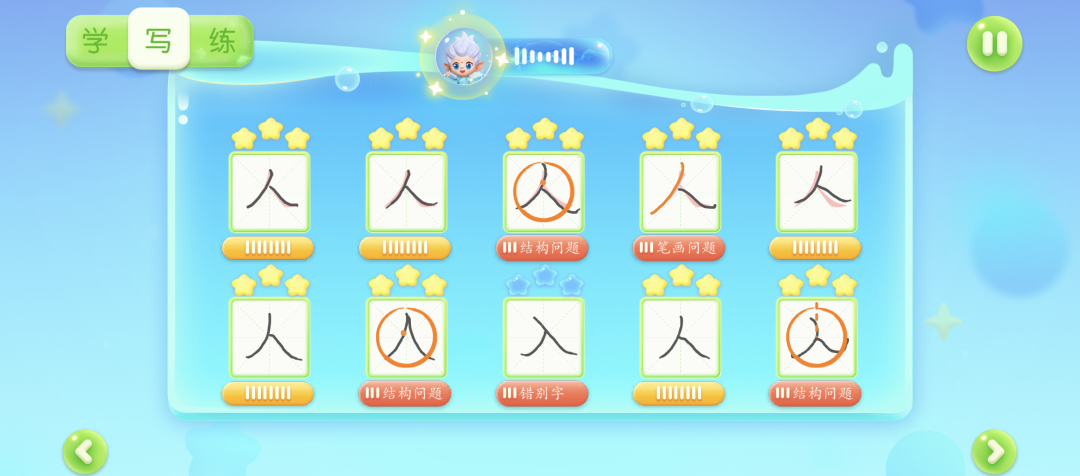 如果写的不好,可爱的IP“笔贝贝”就会出来提醒笔画结构等问题,同时再提醒一遍正确的写法。