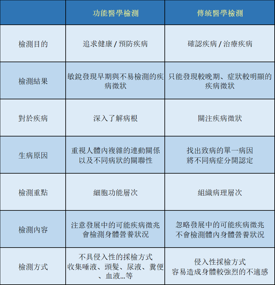 傳統的醫學檢查如生化常規檢查、X光及超音波等,是偵測器官的損傷程度及解剖生理上的改變;而功能醫學檢測則是進一步檢測器官功能方面的改變,以先進及準確的檢驗為工具,檢測個人的生化體質、代謝平衡、生活環境,以達到早期改善並維持生理及情緒的平衡。兩者在醫學上不但不互相排斥,反而有相輔相成的功用,達到健康管理的目的。