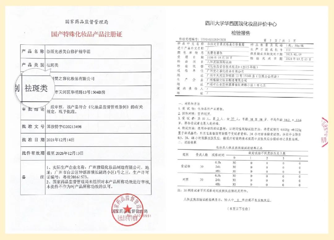 有国家美白祛斑特证,通过了四川大学华西医院0致敏率测试,