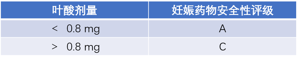 当>0.8 mg时,则为C级,表明在动物实验显示>0.8 mg的叶酸能造成胎仔畸形或死亡,但无妇女对照研究,使用时必须谨慎权衡药物对胎儿的潜在危险。