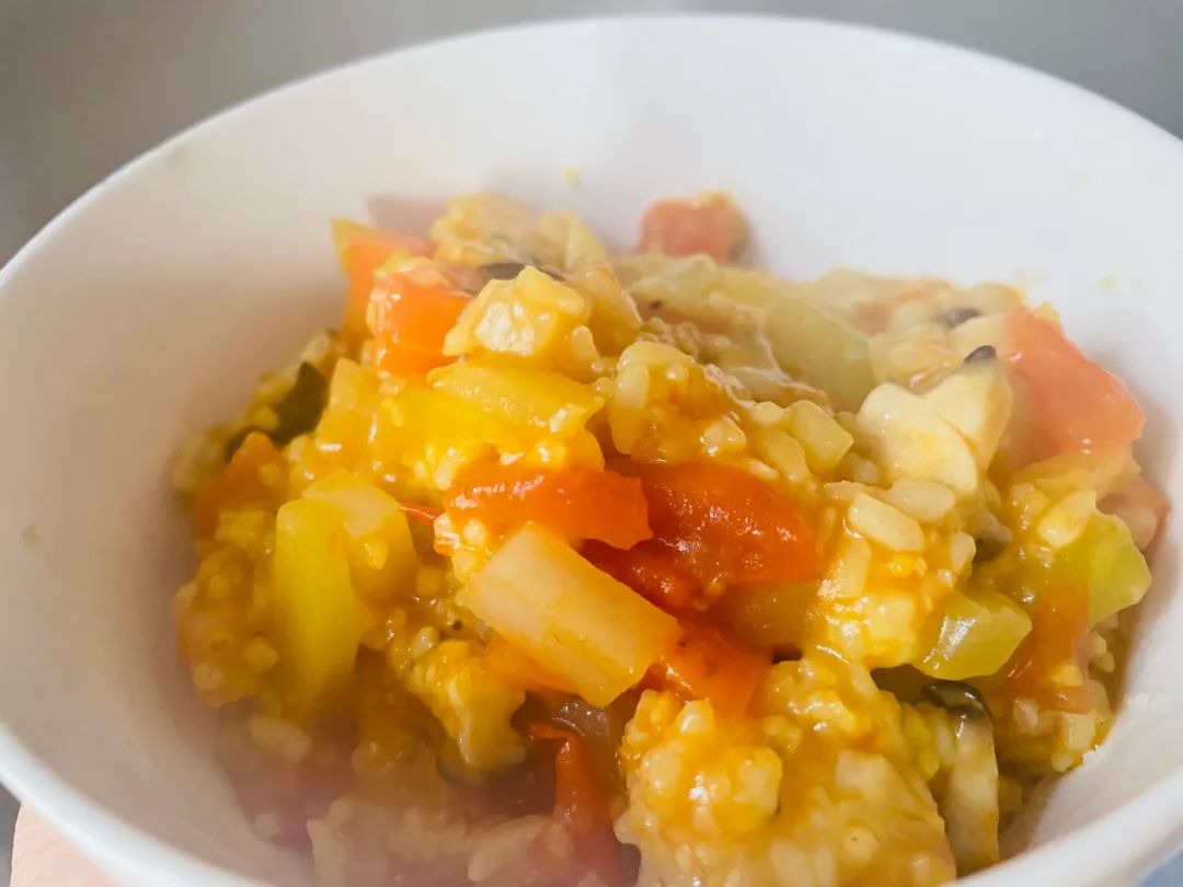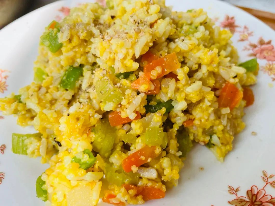3、最后放入米饭,以及姜黄粉、有机酱油、黑胡椒、罗勒碎、少许盐出锅即可